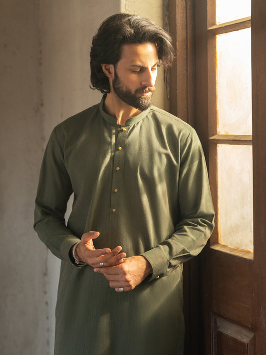 Olive Green Cut & Sew Kameez Shalwar - AL-KS-3503