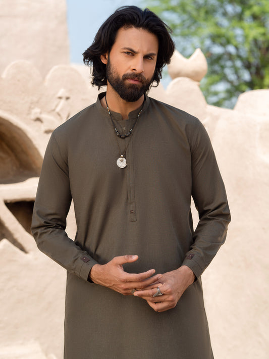 Olive Green Blended Kameez Shalwar - AL-KS-3181