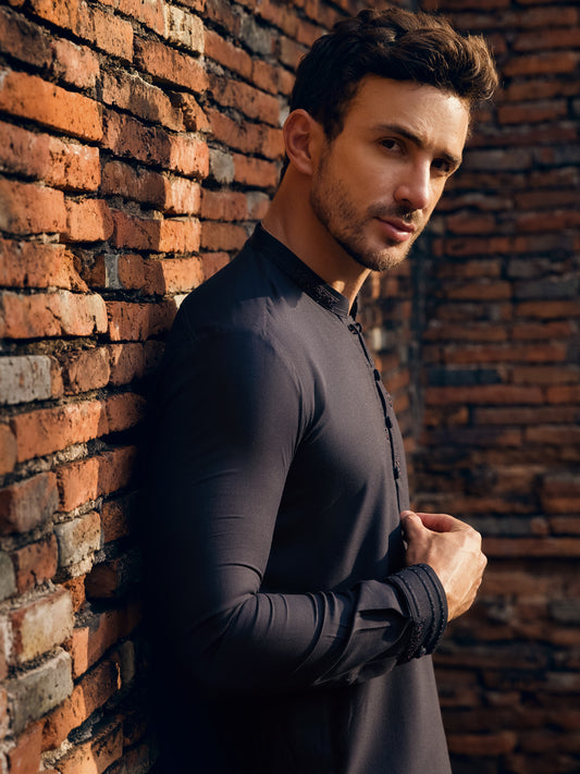 Charcoal Grey Blended Kameez Shalwar - ALWA-KS-433