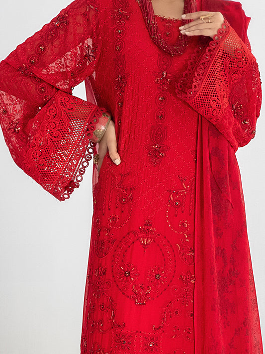 Red Bemberg Chiffon 3 Piece Formal Stitched - AL-3PS-LS-312