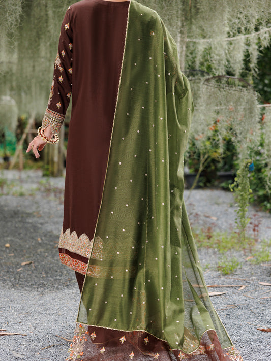Dark Brown Raw Silk Formal 3Pc Stitched - AL-3PS-LS-526