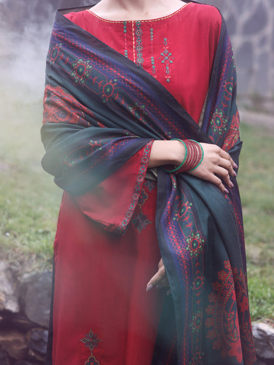 Red Poly Khaddar 3Pc Stitched - AWP-3PS-880