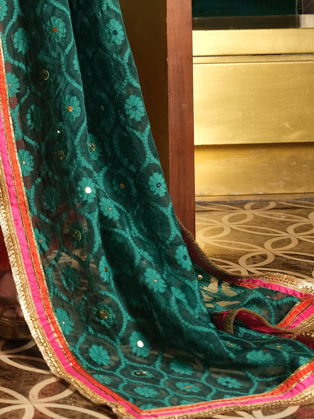 Paneled Embroidered Angarkha, Adorned With Lace And Tassels, Paired With Jacquard Bootcut Pants, And Jacquard Duppata.