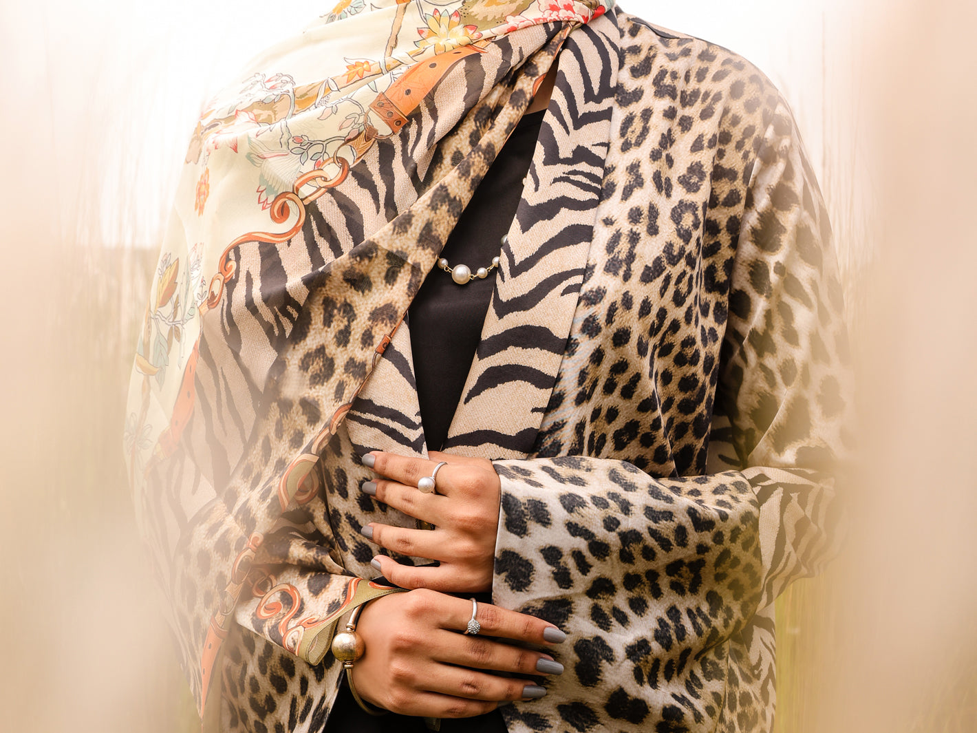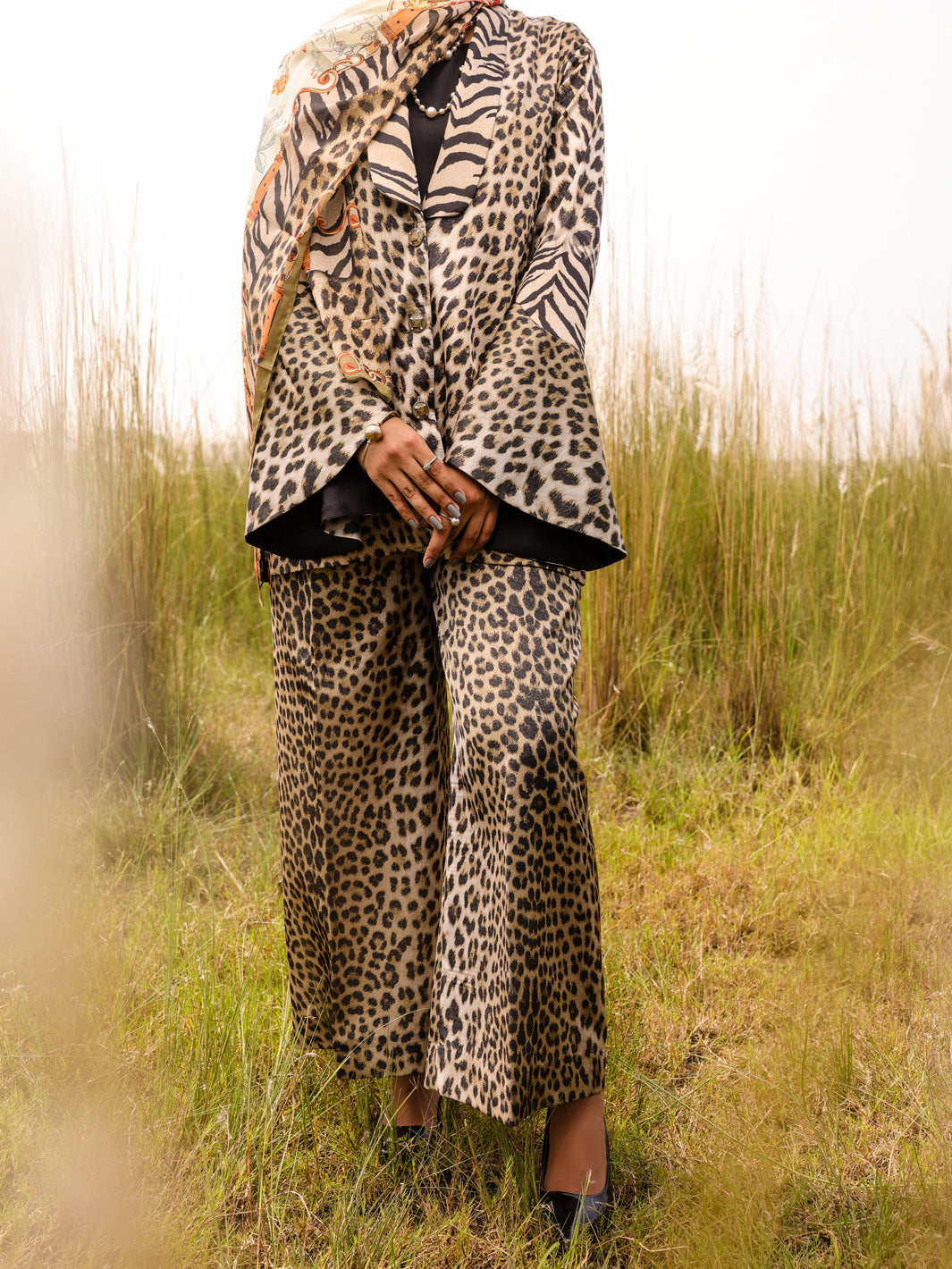 Animal Printed Shawl Lapel Loose Shirt With Button Details and Flared Sleeves Paired With Black Inner, Loose Printed Silk Trouser and Silk Printed Stole.