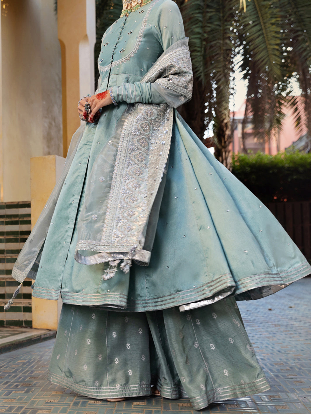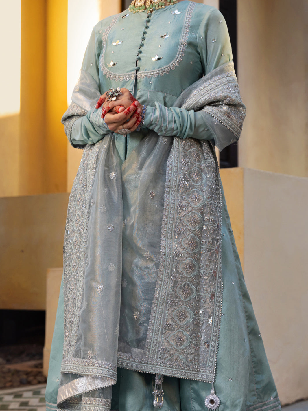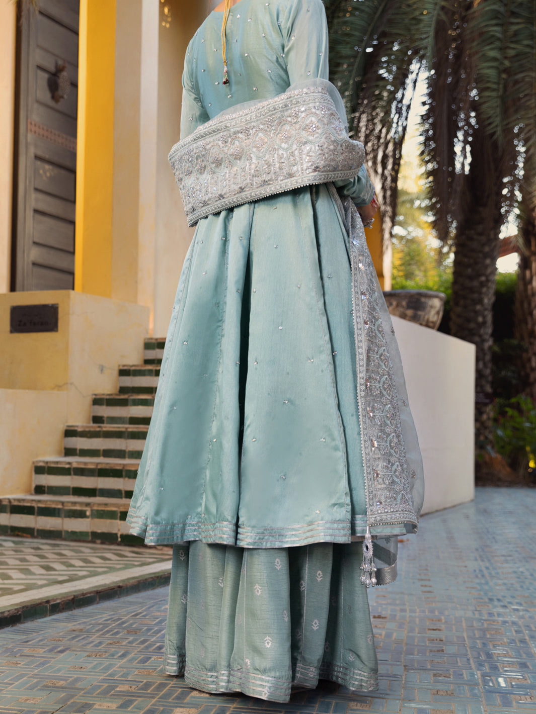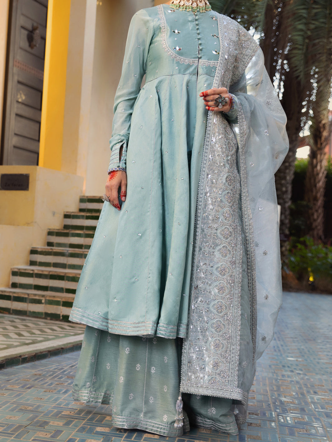 Frock Style Long Shirt With Panels, Detailed With Neckline Embroidery and Mirror Work. Shirt Is Adorn With Sequence Touch Ups and Gotta Laces. Paired With Shimmer Net Embroidered Dupatta and Block Printed Lose Ijar.