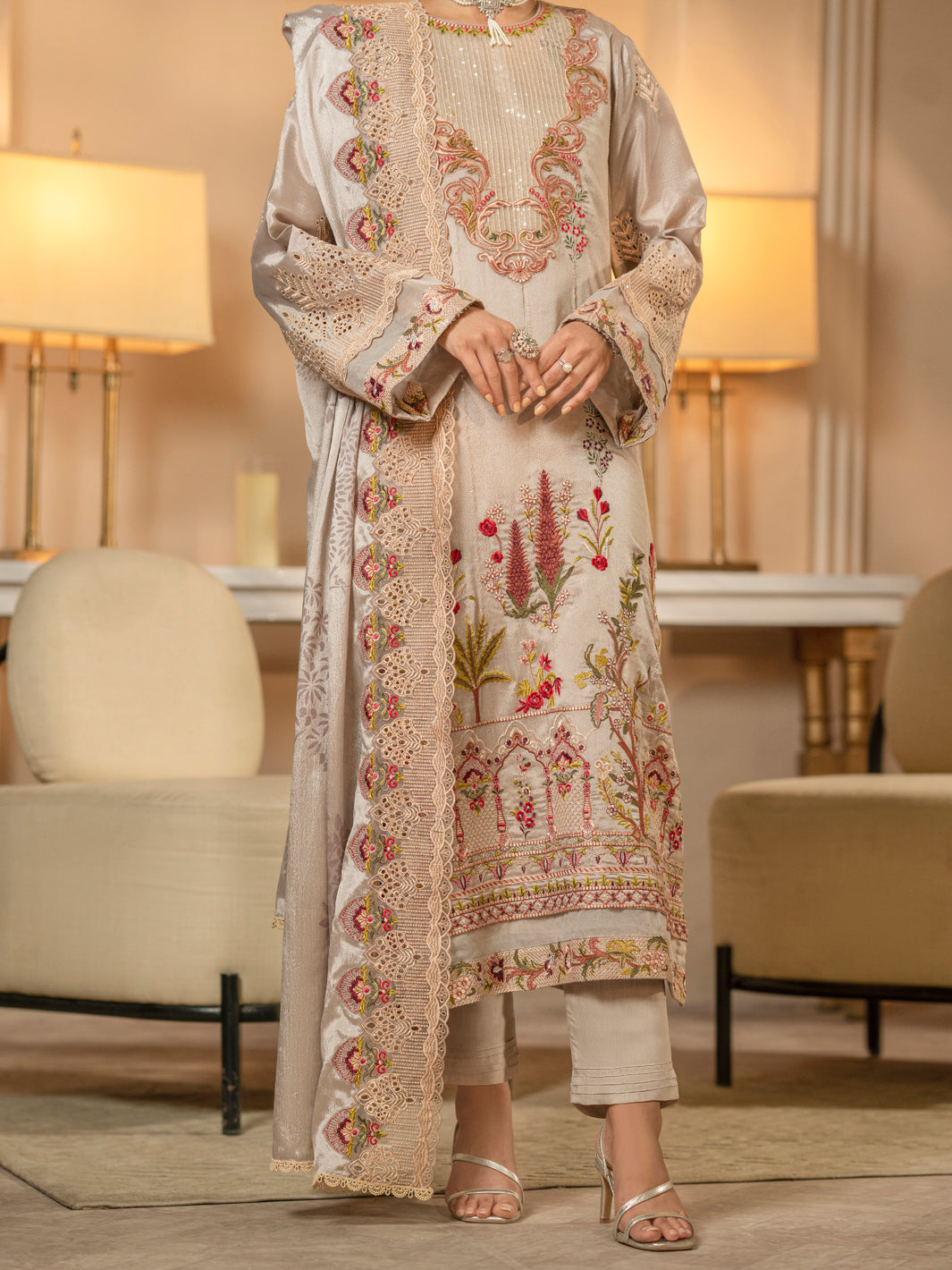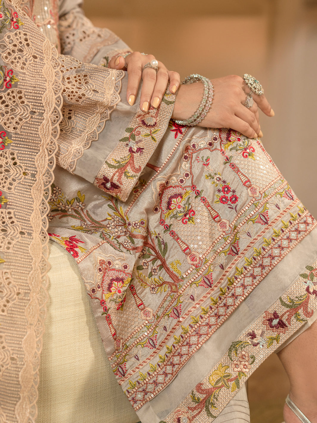 Shimmer Chiffon Long Length Shirt With Fully Embroidered On Front And Sleeves With Schiffli And Sequins, Paired With Panelled Loose Pants Paired With Shimmer Chiffon Embroidered And Printed Dupatta.