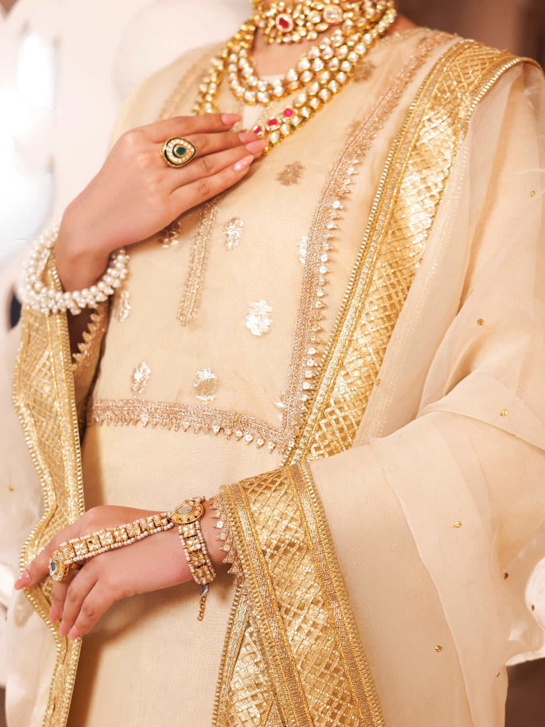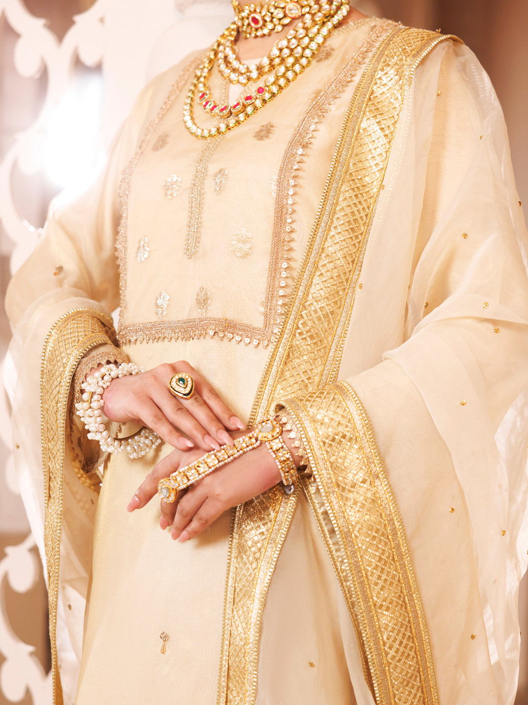 Long Organza Shirt With Gota Embroidery Paired With Straight Pants With Embroidered Detailing And Organza Dupatta With Chan And Lace On Borders