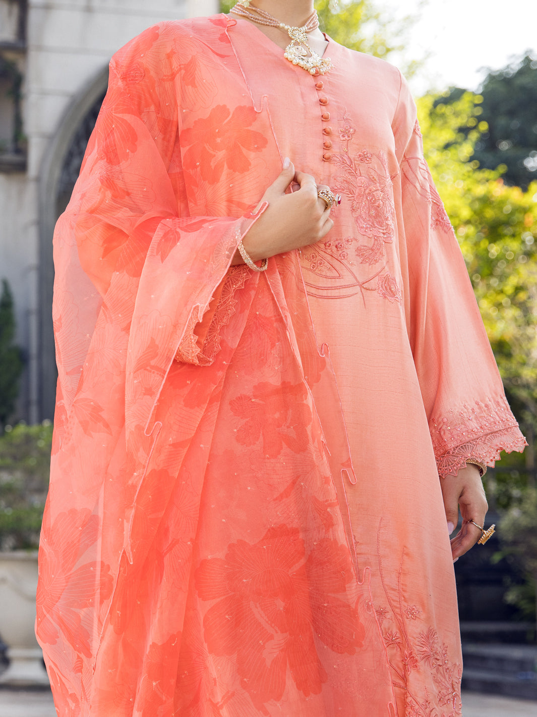 Raw Silk Dyed Sleeves Embroidered With Handwork: 1.1 Meters