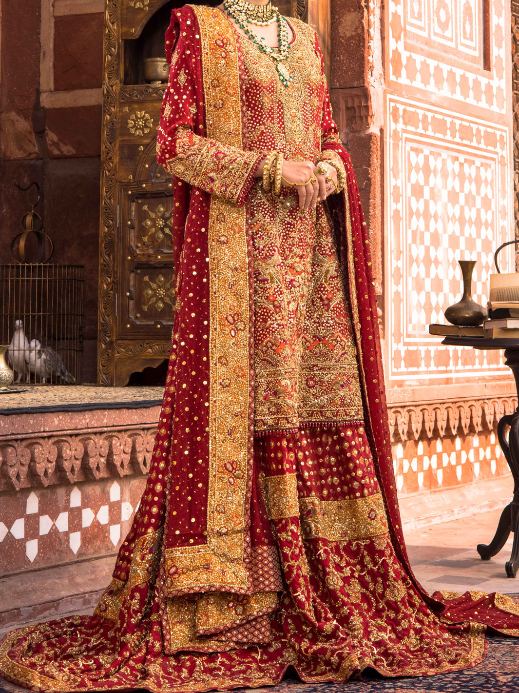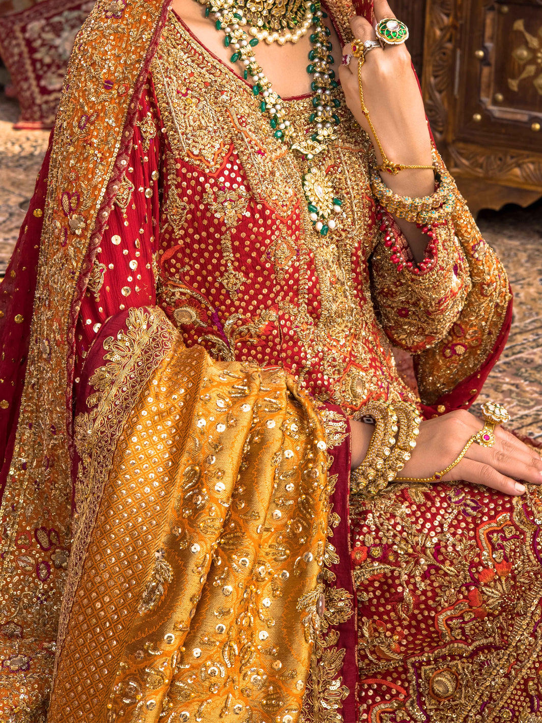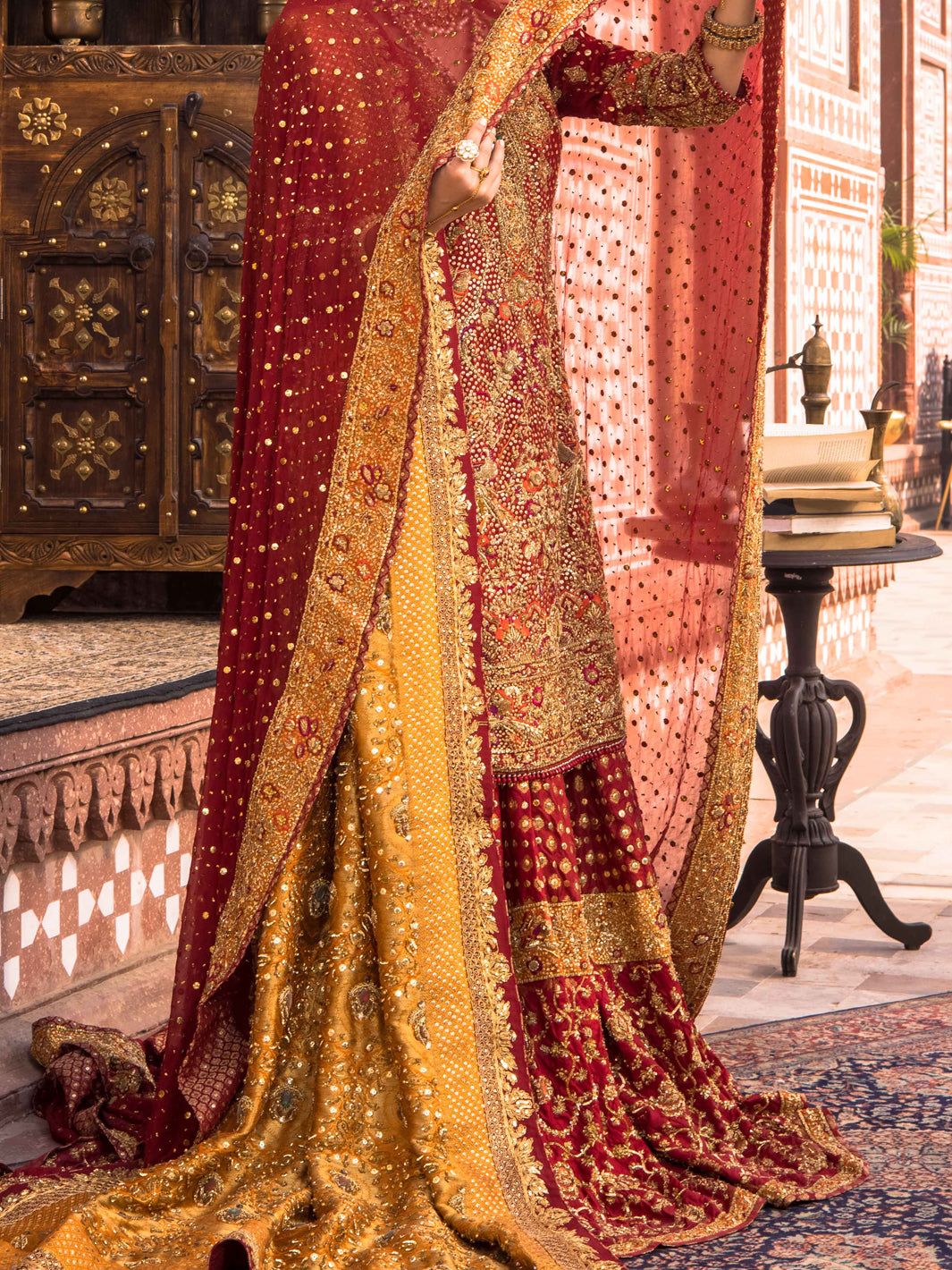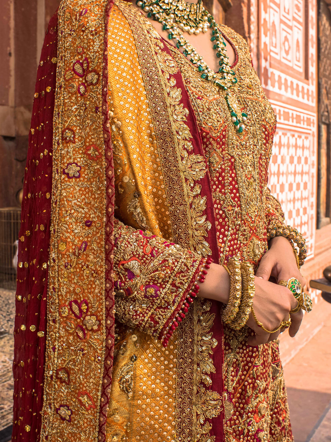 The coordinated gharara is embellished with delicate and beautiful gold handwork done by our expert artisans. The exceptionally beautiful bridal is an absolute showstopper.