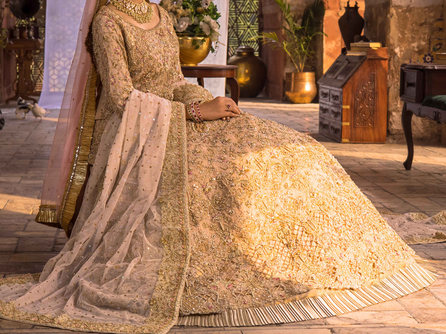 The pastel pink dupatta features thick golden embroidered borders, details of dupatta is adorned with hand work, and dense spray of handwork sequence.