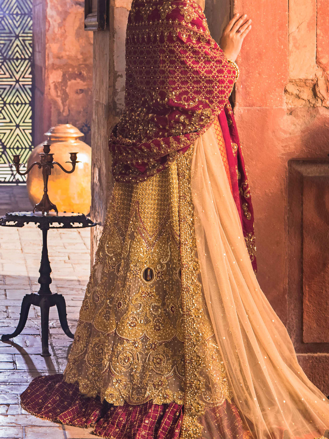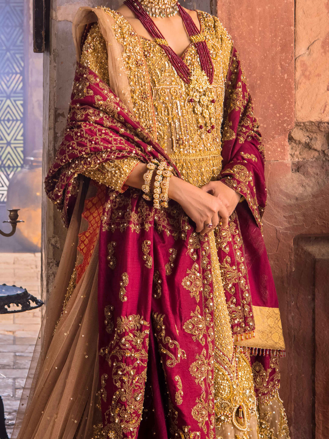 The most royal kalidaar outfit in a beautifully festive traditional gold, embellished heavily with cord work, sequence and pearls. The wonderfully flared kalidaar in net Fabric has a cut-work detailing with sophisticated customary hanging tassels. The majestic golden kalidaar is complimented with maroon shaded raw silk lehnga.