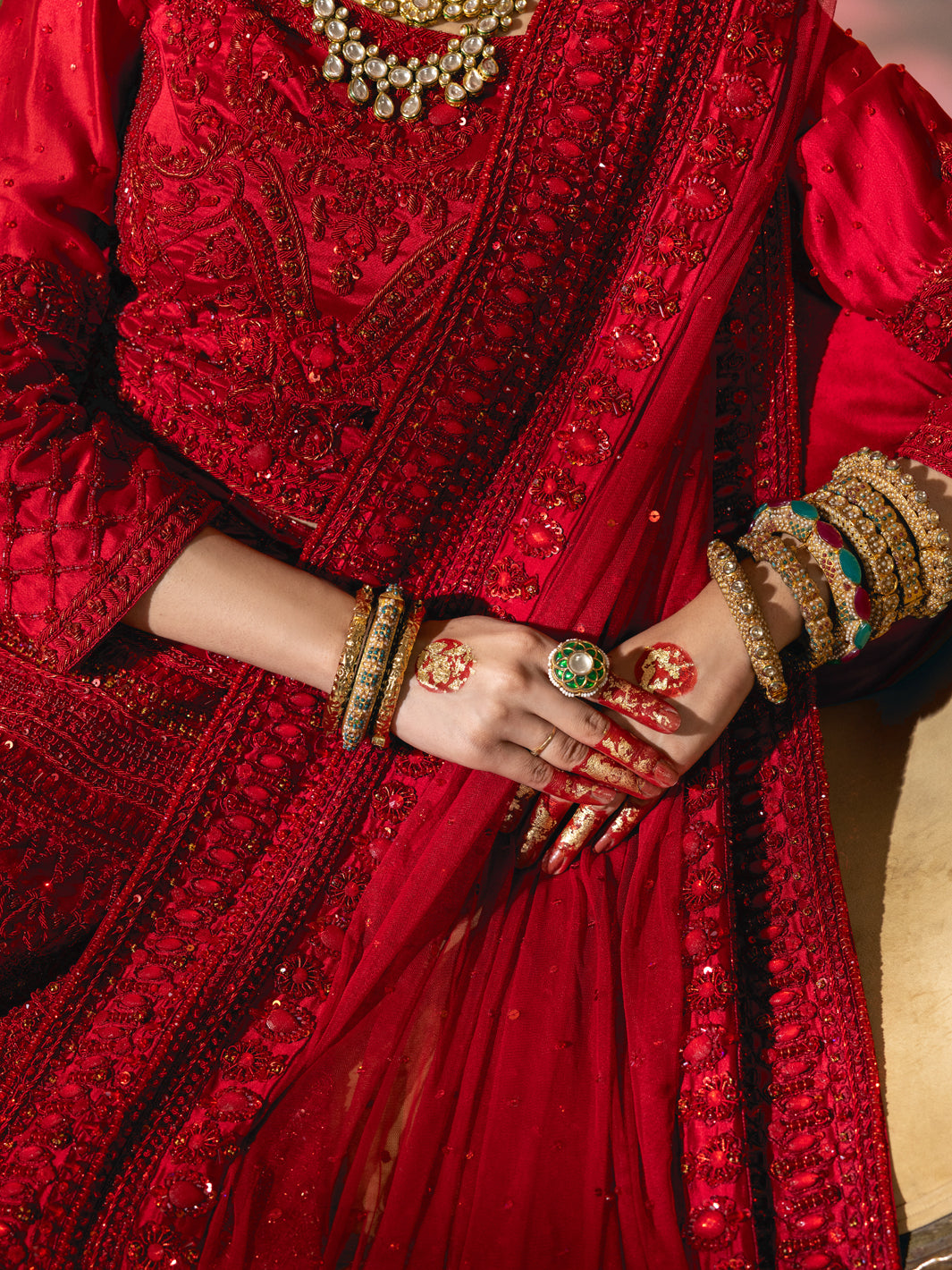 Epitome of timeless elegance, our red Bridal Ensemble, meticulously designed to make you radiate sophistication on your special day. The ensemble starts with a Heavily Embroidered Sheesha Silk Choli, adorned with stones, naqshi, dabka, and a shimmering cascade of sequins and crystals. The intricacy of the embellishments ensures a captivating and luxurious feel.