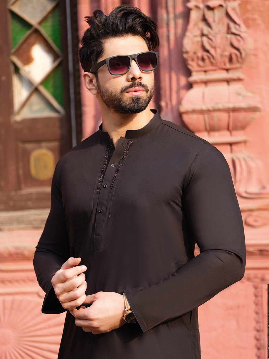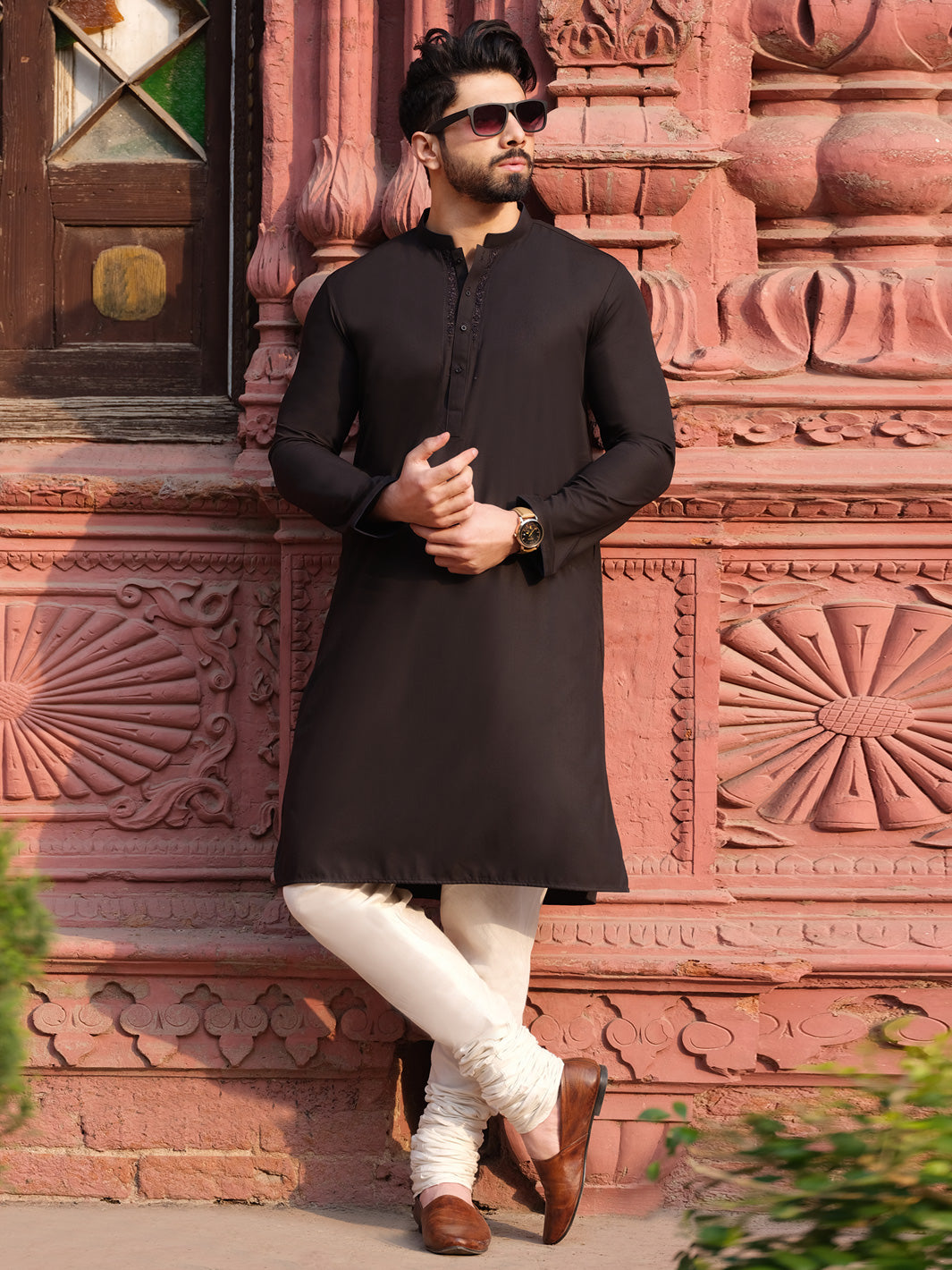 Black Kurta Stitched In Blended Fabric With Embroidery Detail On Sides Of Placket