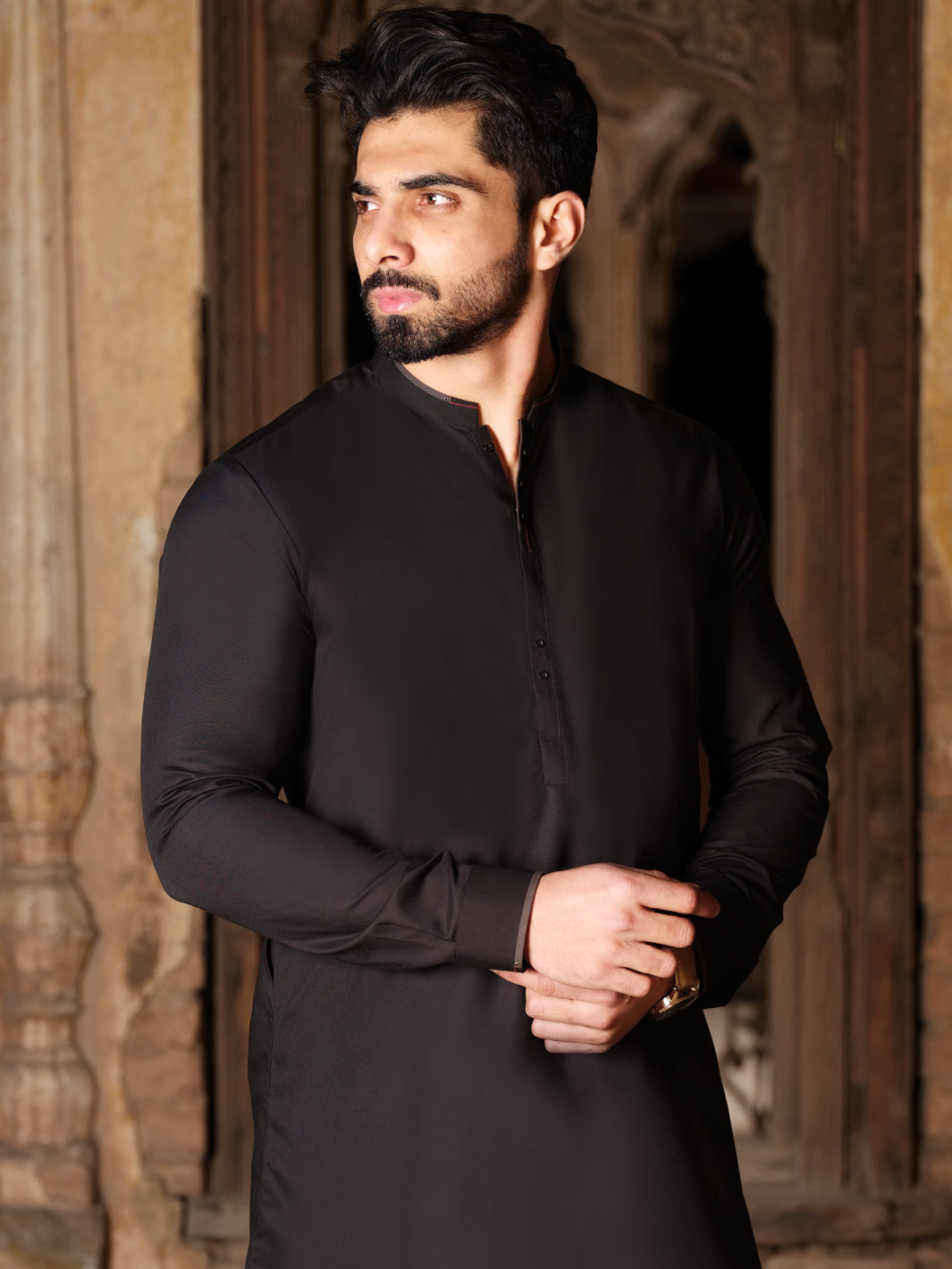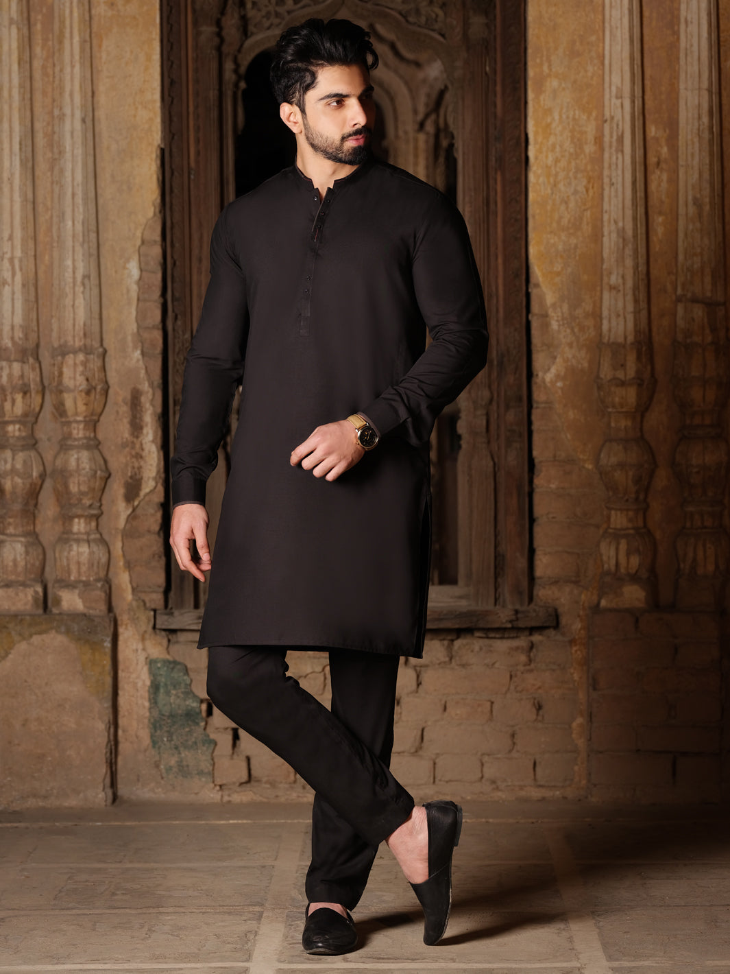 Black Color Kurta Pajama With Cut And Sew Details On Collar Placket And Cuffs.