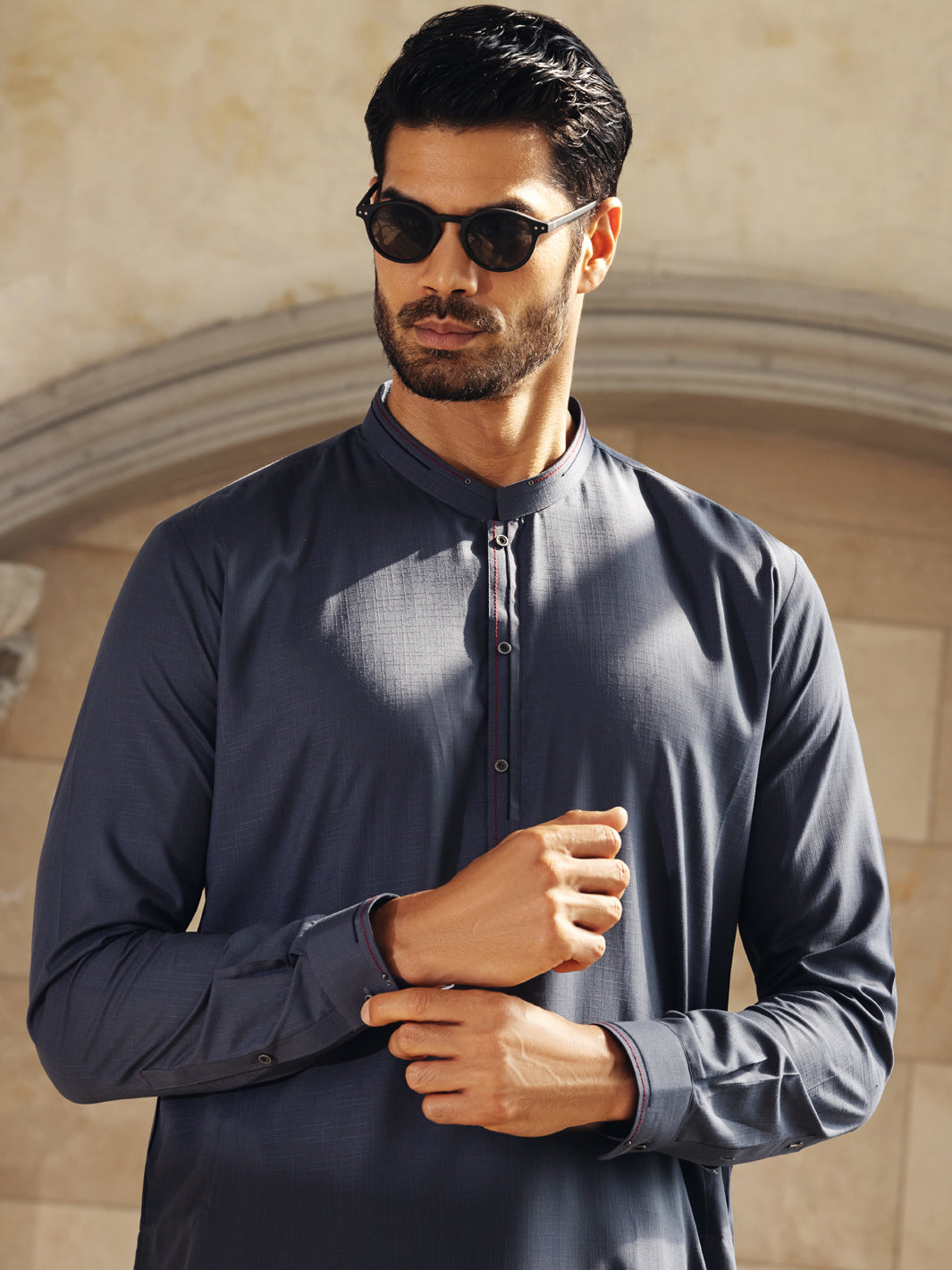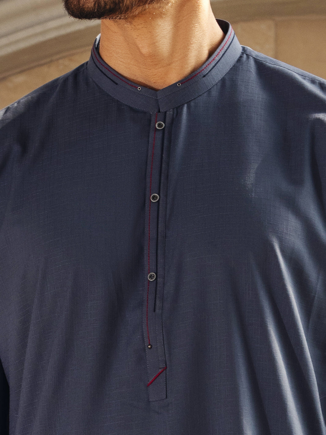 Grey Kameez Shalwar With Black And Red Accent Details