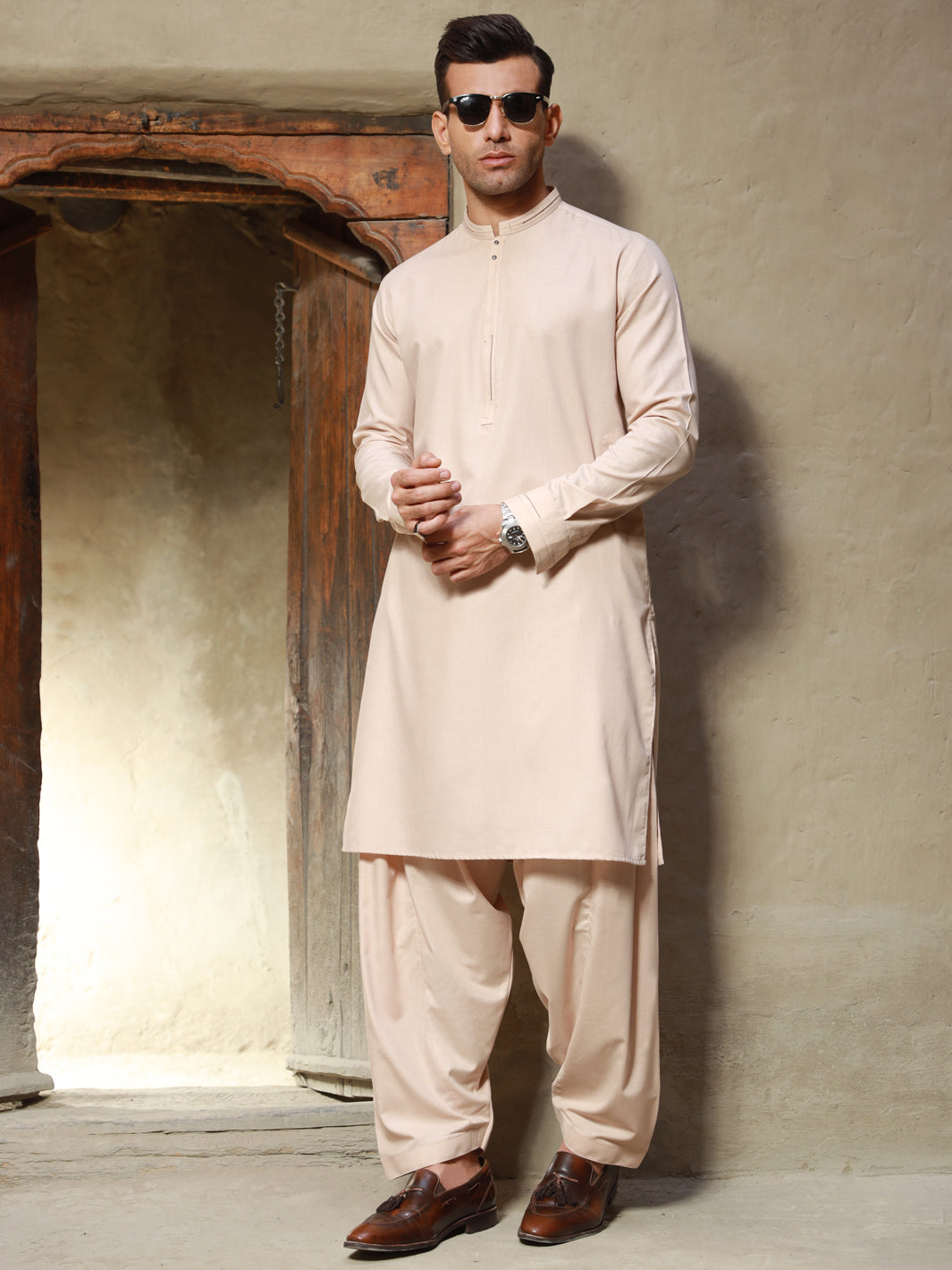 Beige Kameez Shalwar With Cut And Sew Detail On Collar Placket And Cuffs