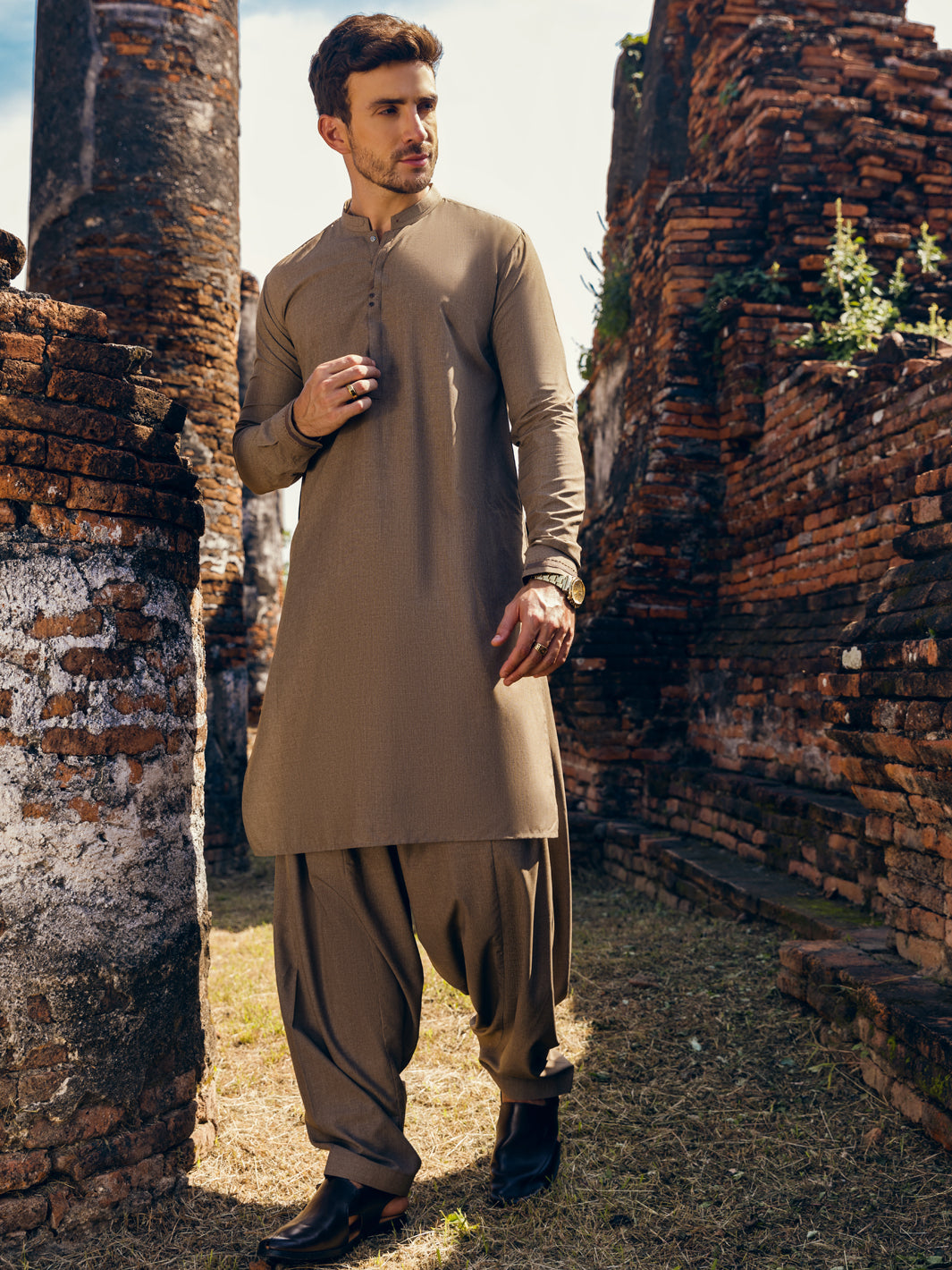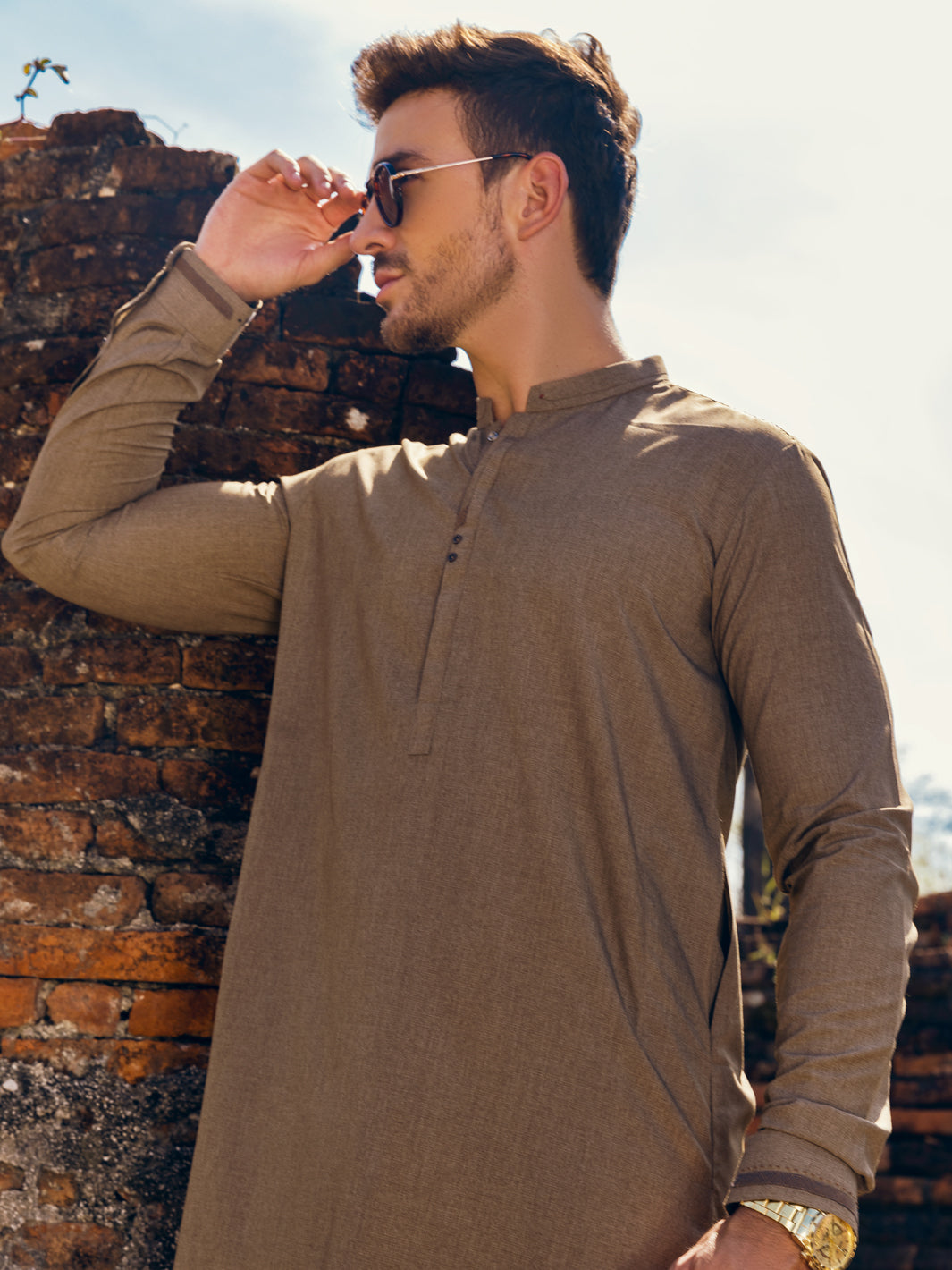Brown Kameez Shalwar With Cut and Sew Detail on Placket Collar and Cuffs