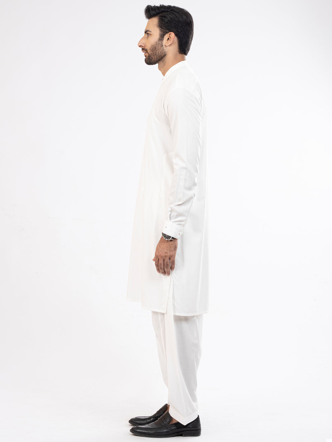 White Cut and Sew Kameez Shalwar With Invisible Placket Light Stitch and Rivet Details on Placket, Collar and Cuffs