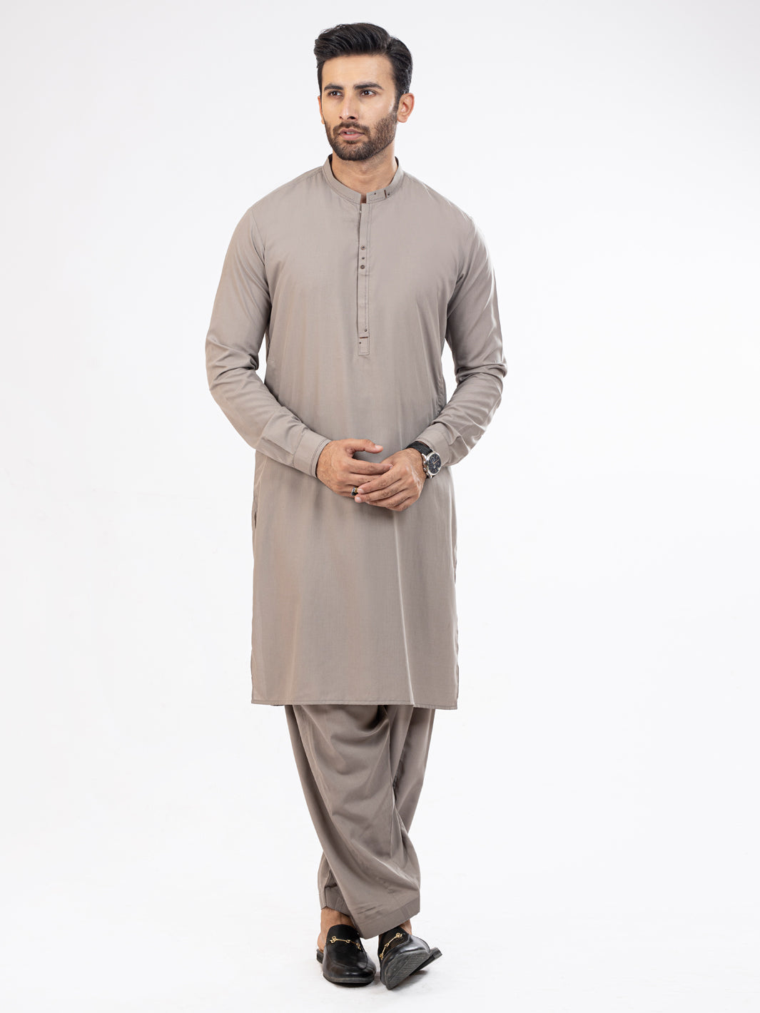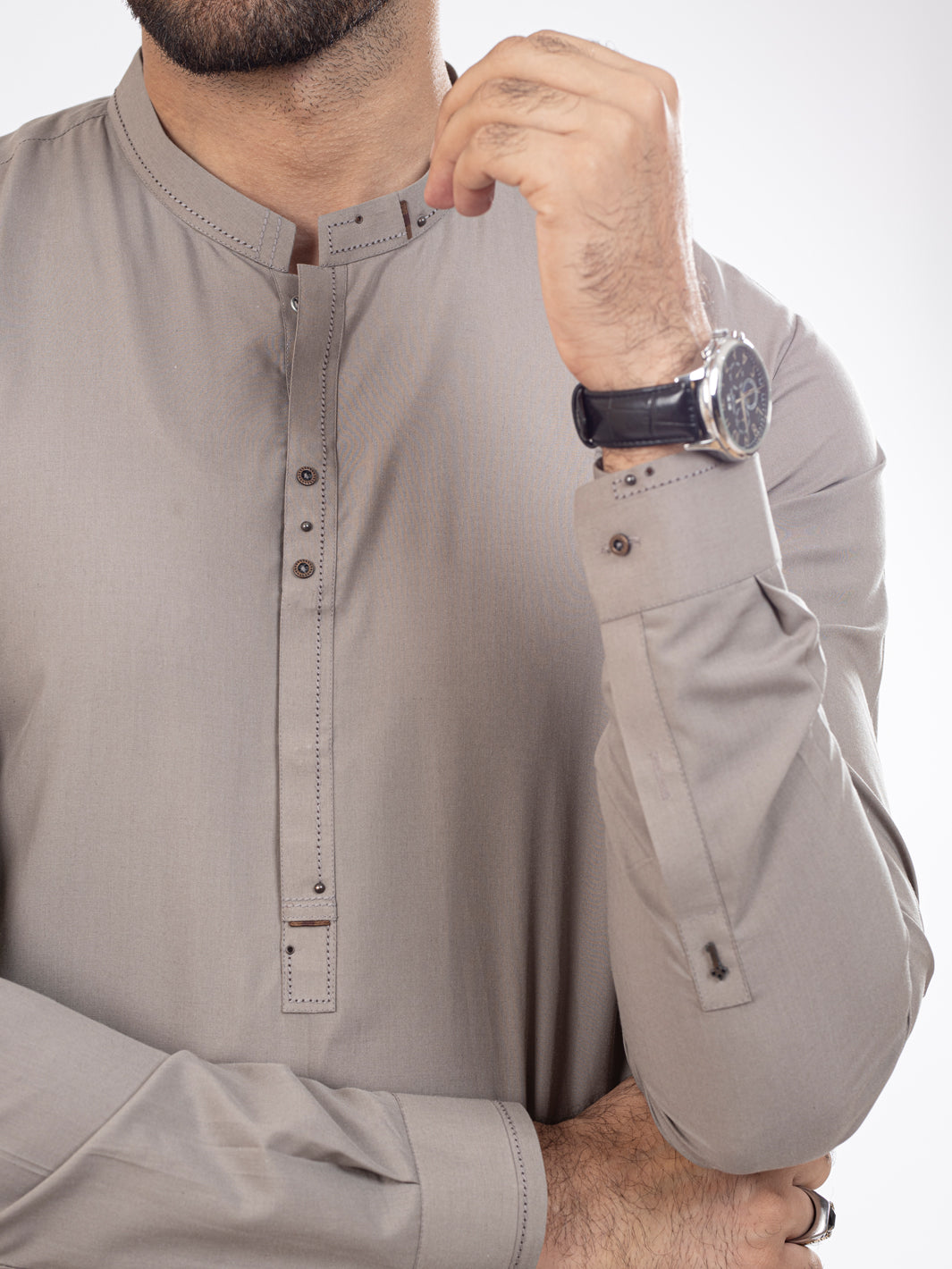 Light Grey Kameez Shalwar With Cut and Sew Detail on Placket Collar and Cuff