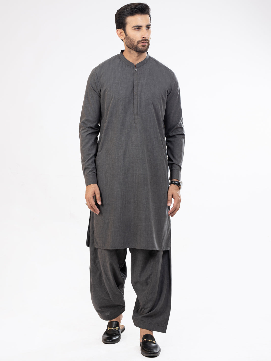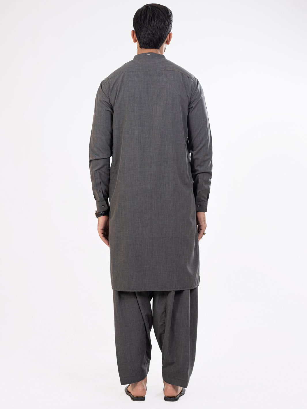 Grey Kameez Shalwar With Cut and Sew Detail on Placket and Cuff