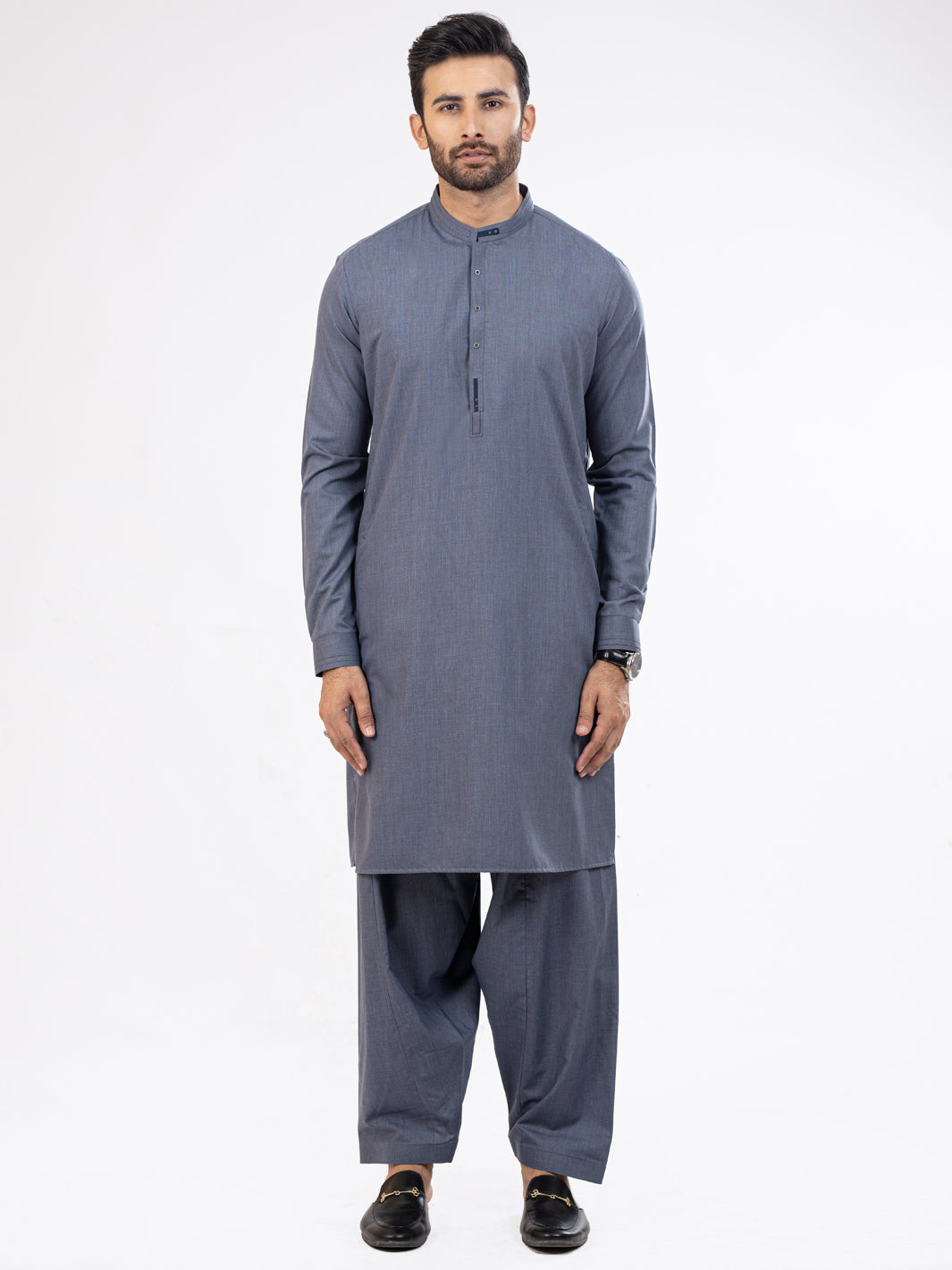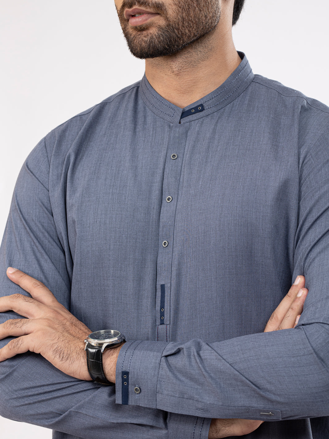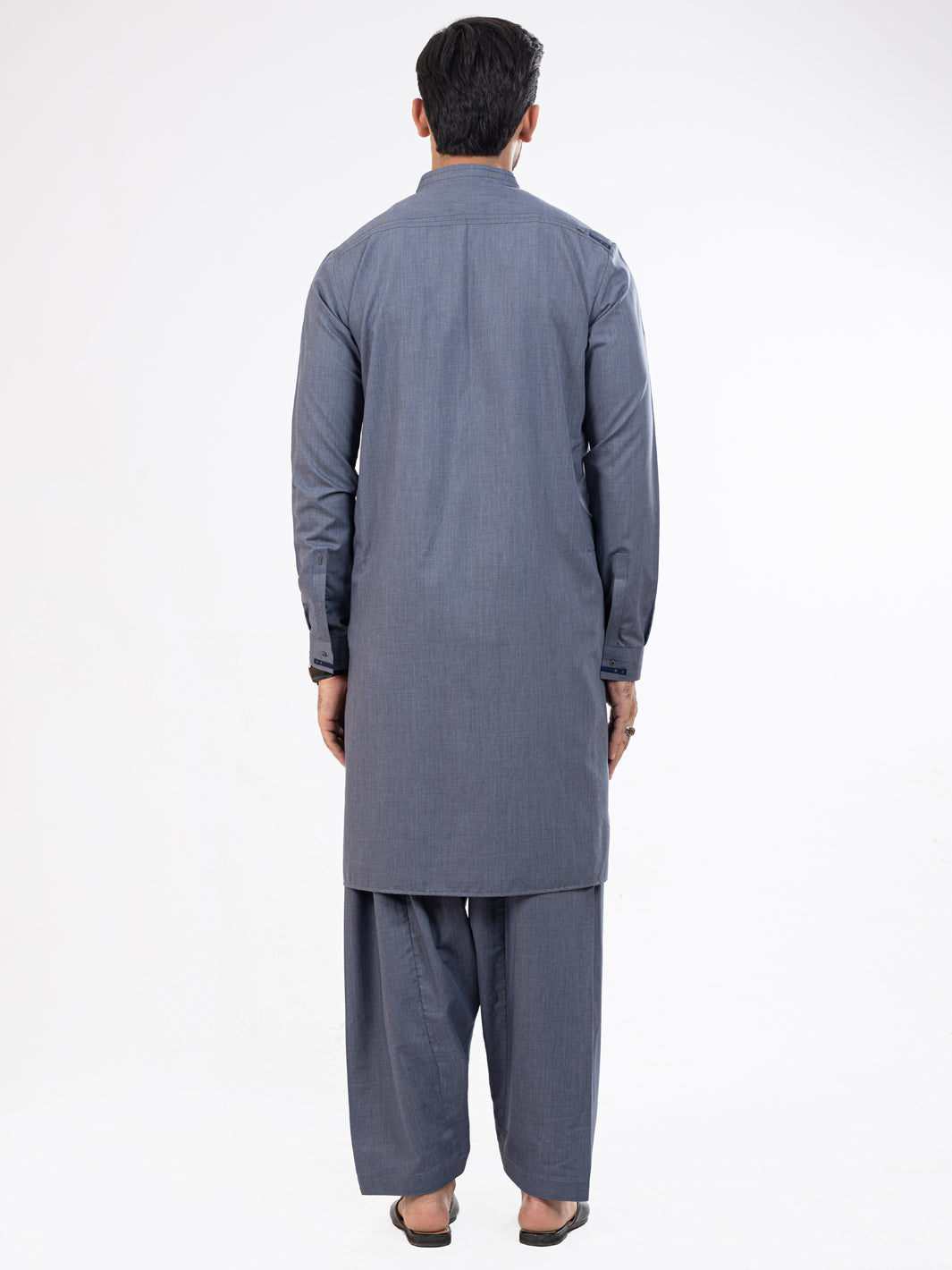 Blue/ Grey Kameez Shalwar With Cut and Sew Detail on Placket Collar and Cuff