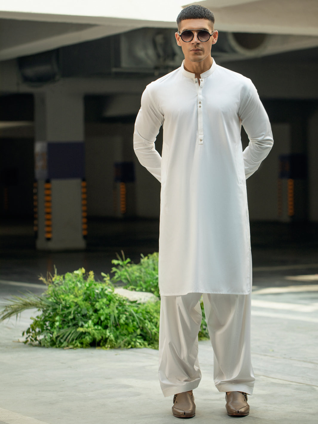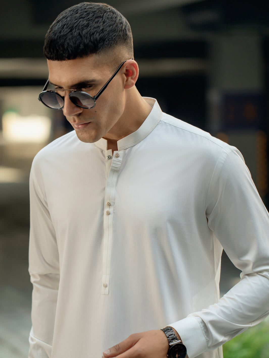 White Kameez Shalwar With Cut and Sew Detail on Collar Placket and Cuffs