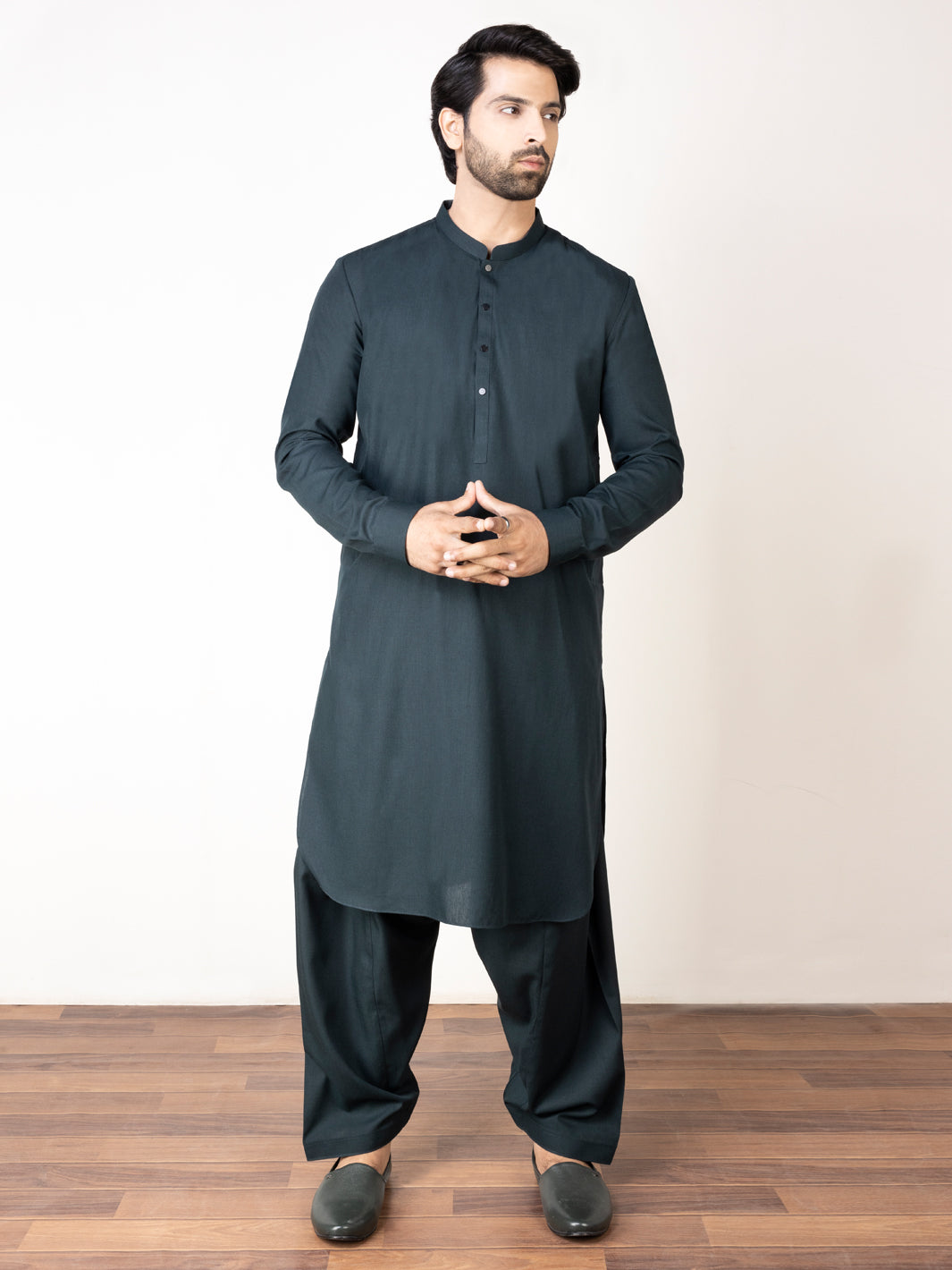 Plain Green Kameez Shalwar With Metallic Snap Buttons
