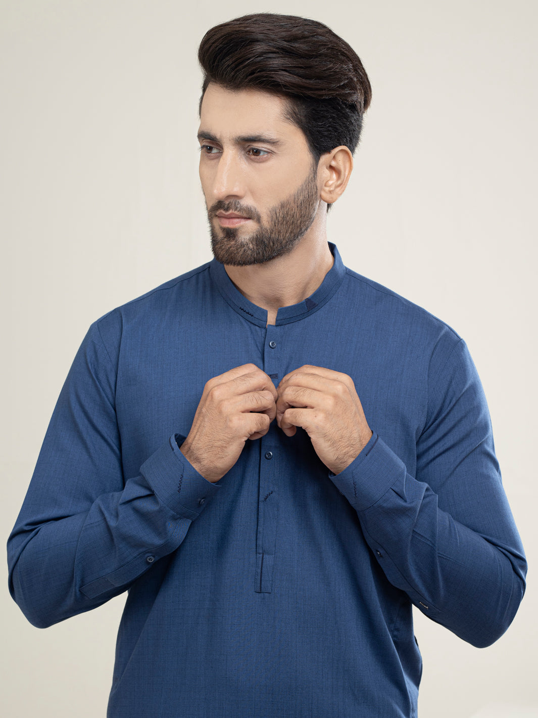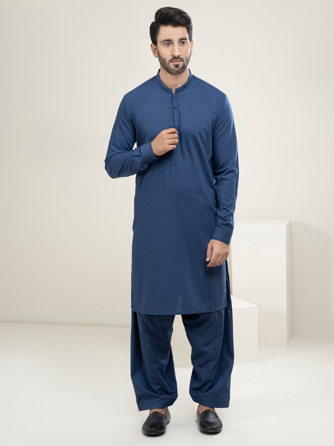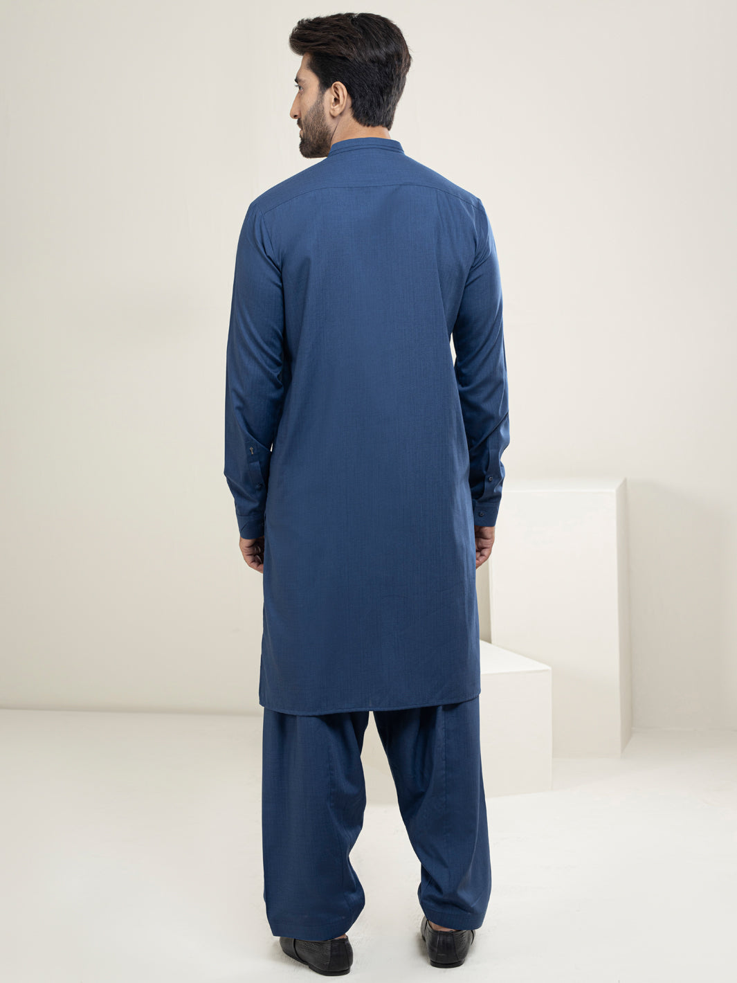 Blue Kameez Shalwar With Cut and Sew Detail on Placket and Cuffs