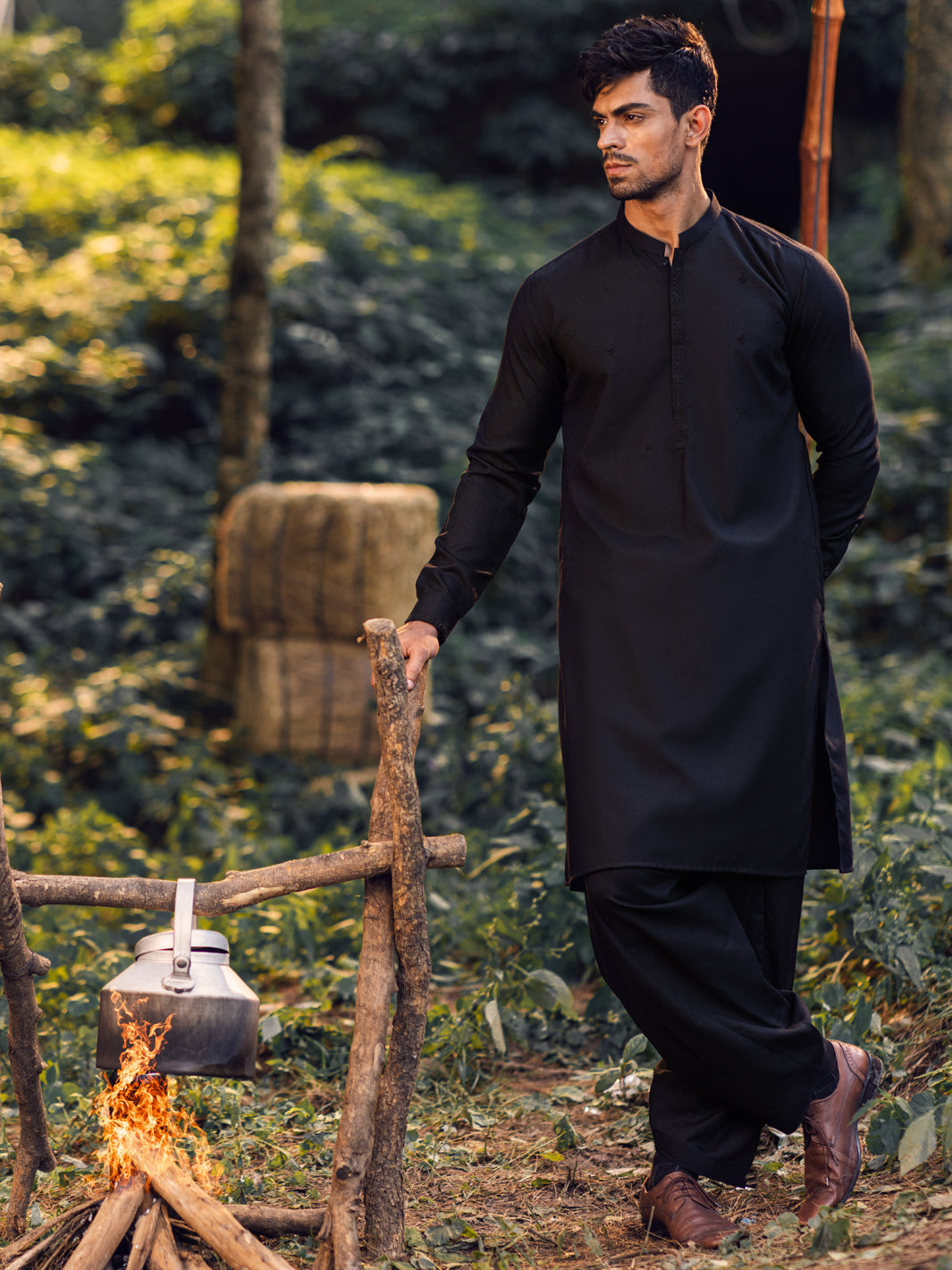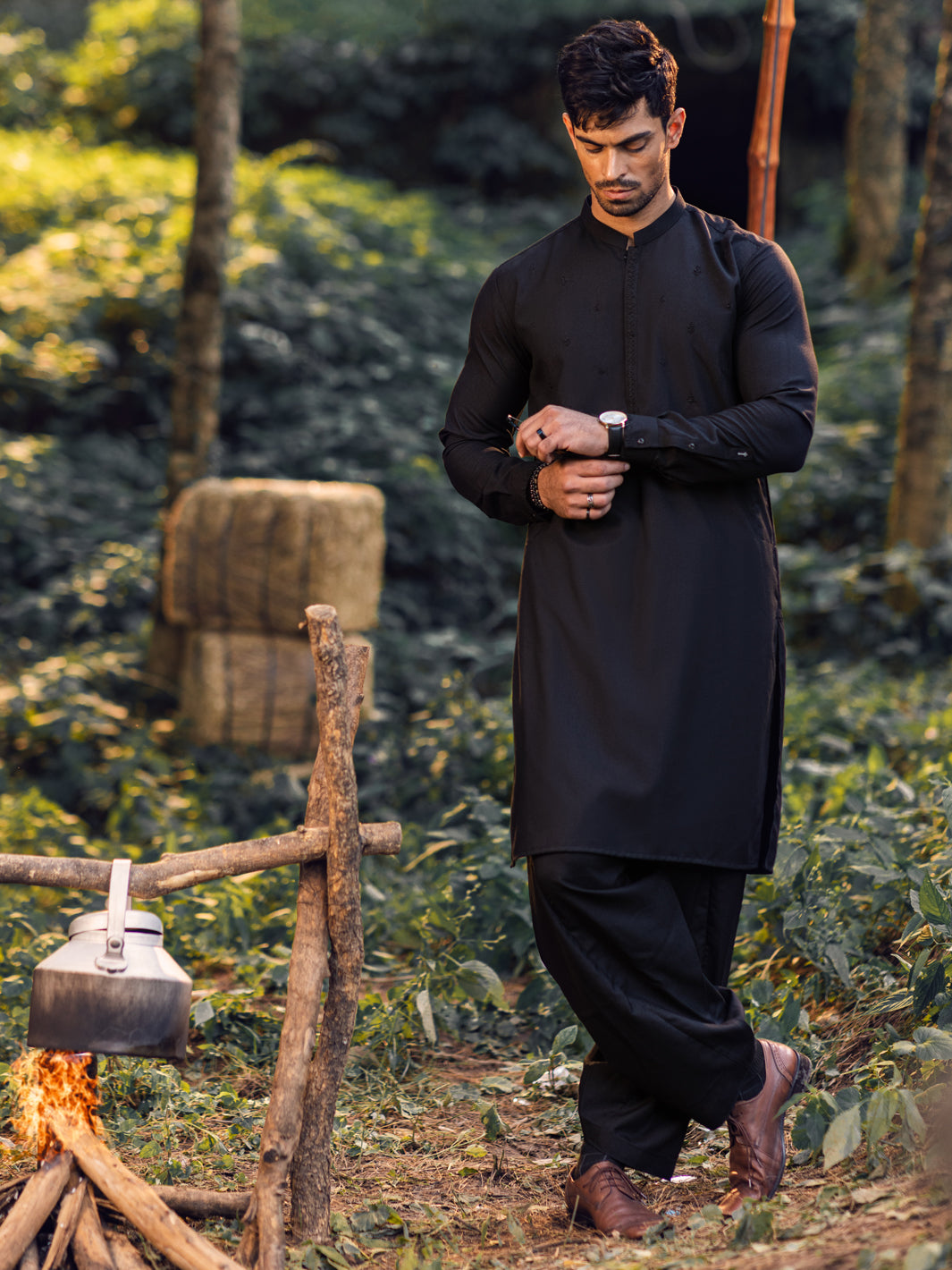 Semi-Formal Kameez Shalwar With Emboidery Details On Placket, Chest And Cuffs