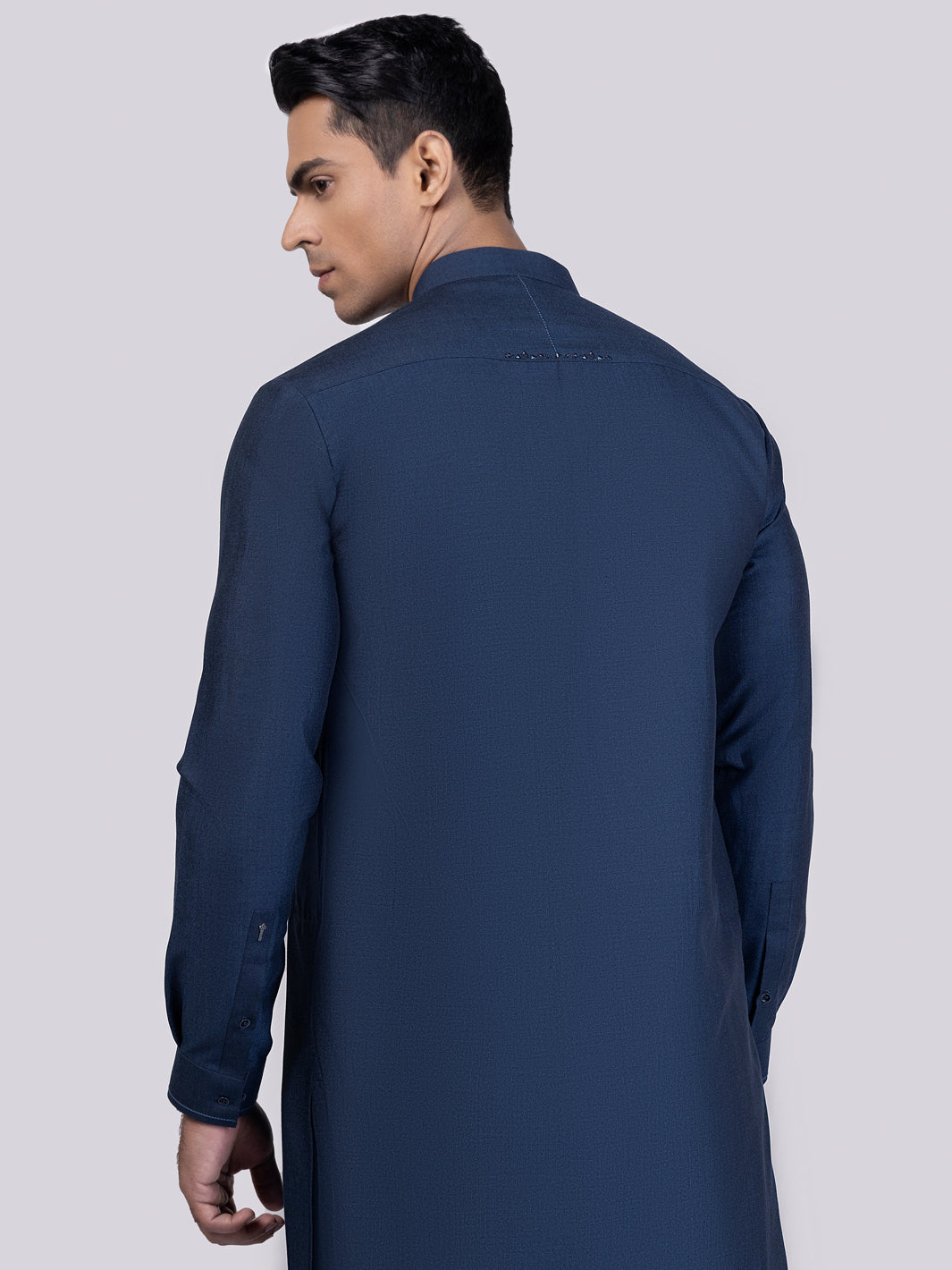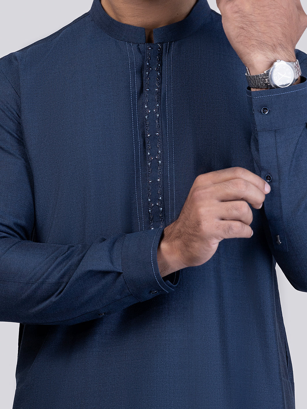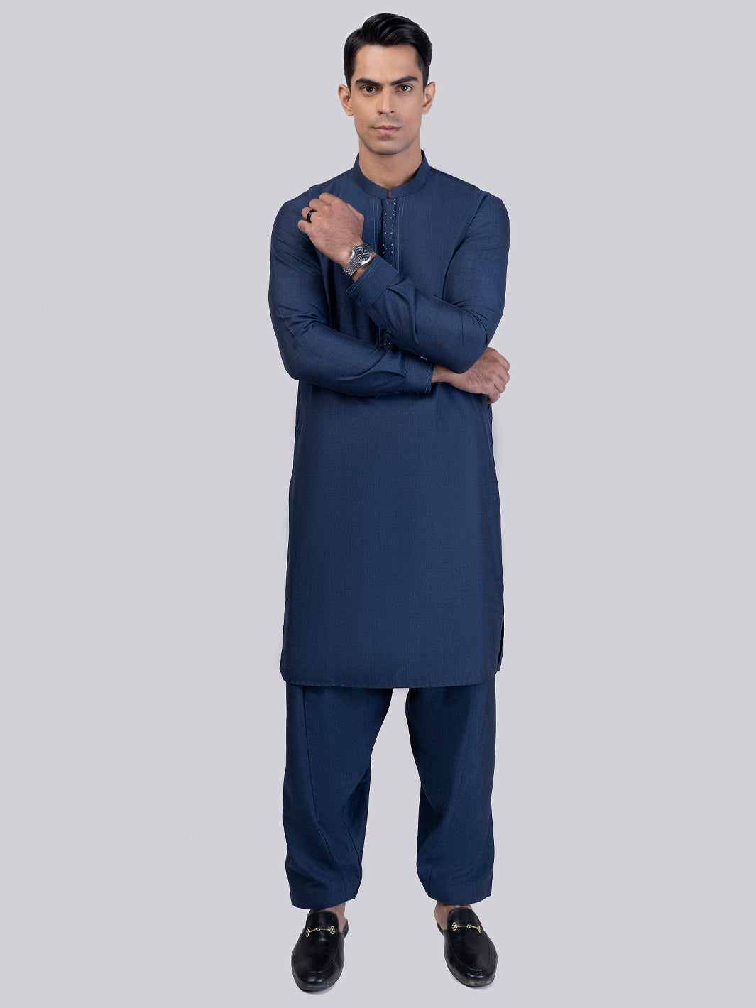 Semi-Formal Kameez Shalwar With Embroidery Details On Placket And Stitches Around The Placket