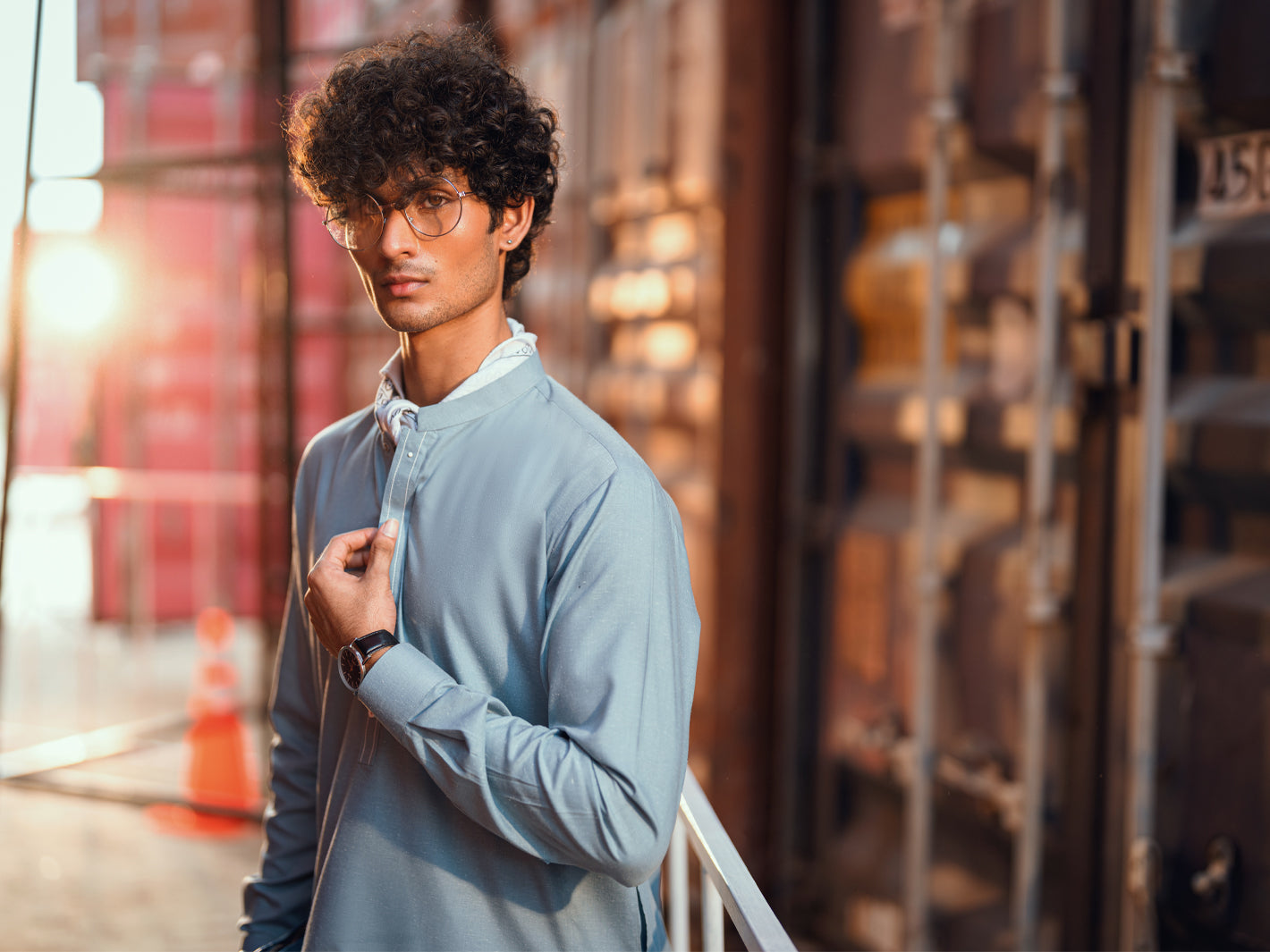 Classic Kameez Shalwar Enhanced With Contemporary Cut-And-Sew Detailing on the Placket