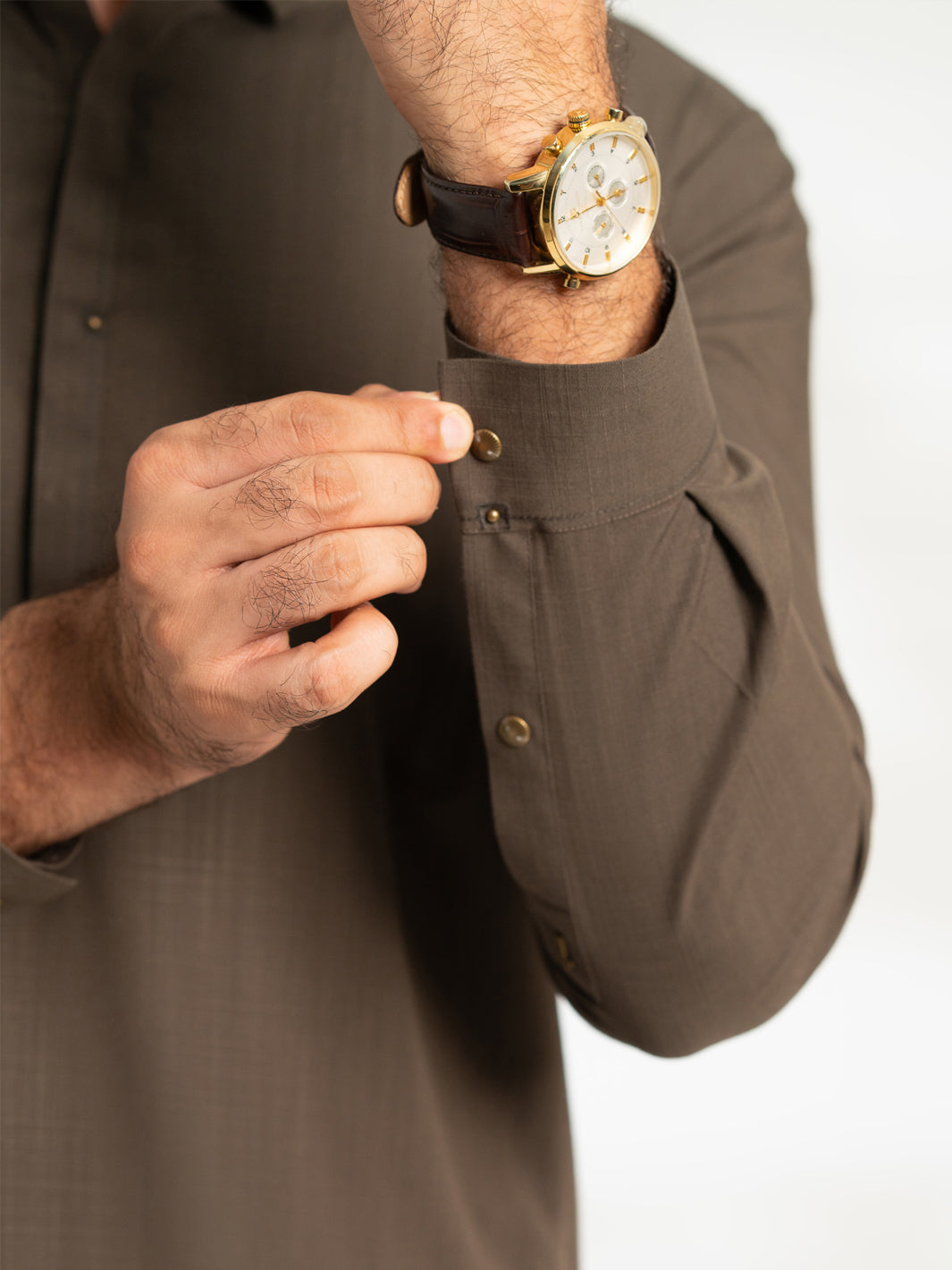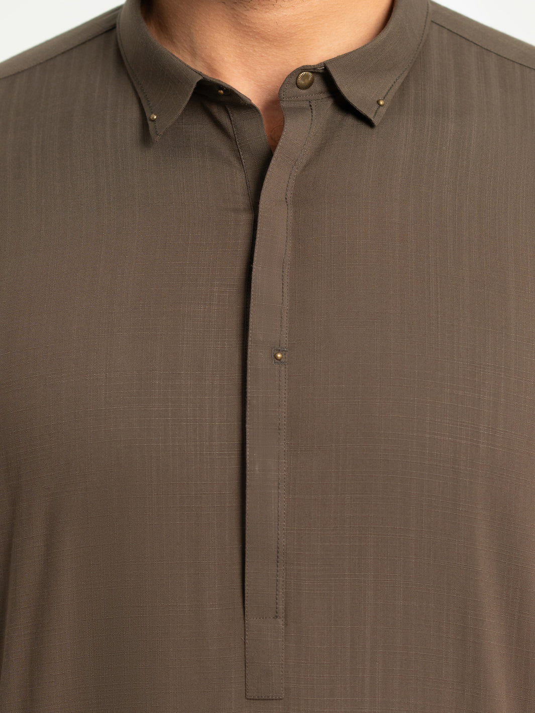 Dark Olive Kameez Shalwar With Narrow Shirt Collar and River and Stitch Detail on Collar and Placket