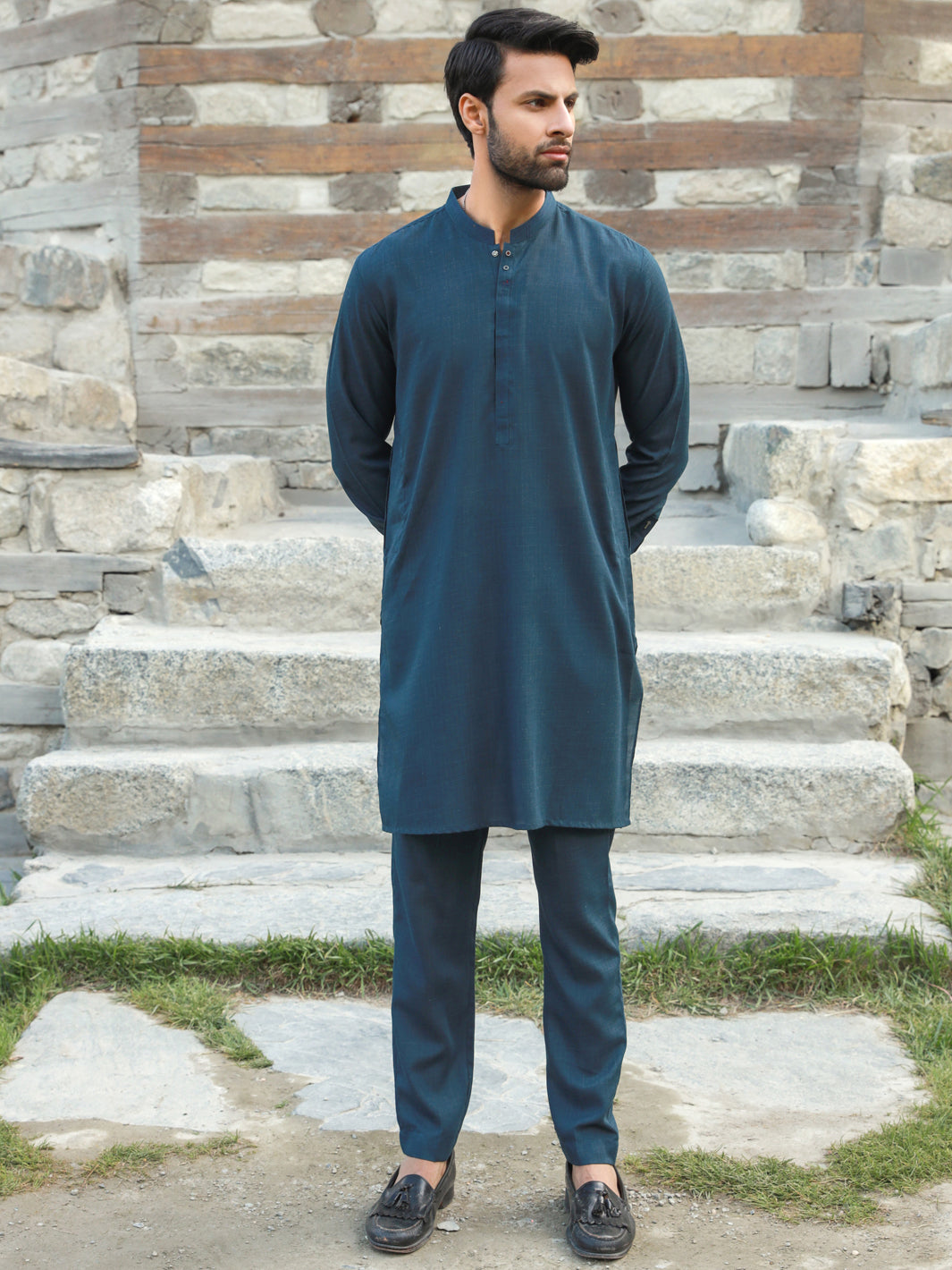 Teal Blue Kurta Trouser With Cut And Sew Detail On Placket And Cuffs