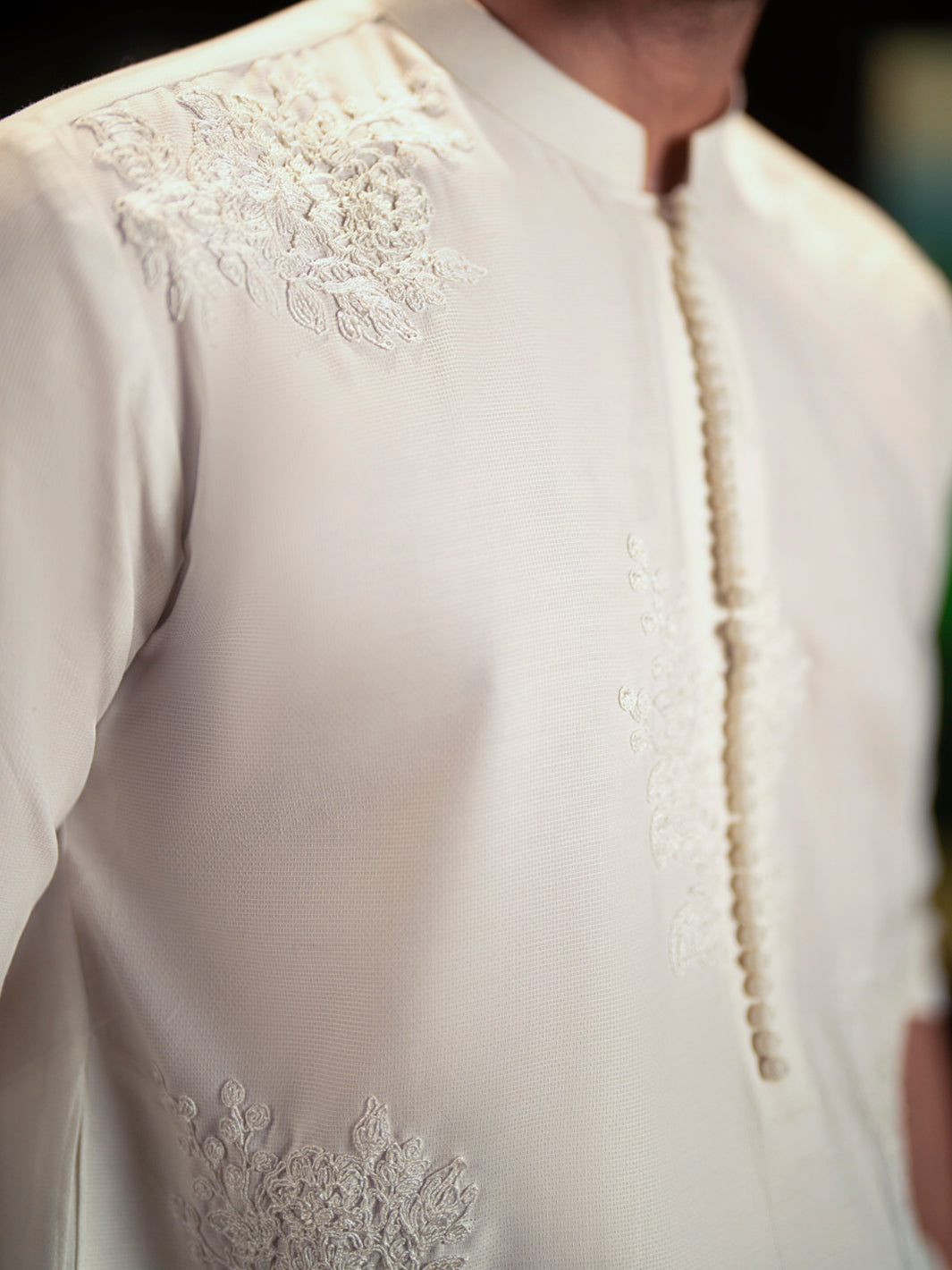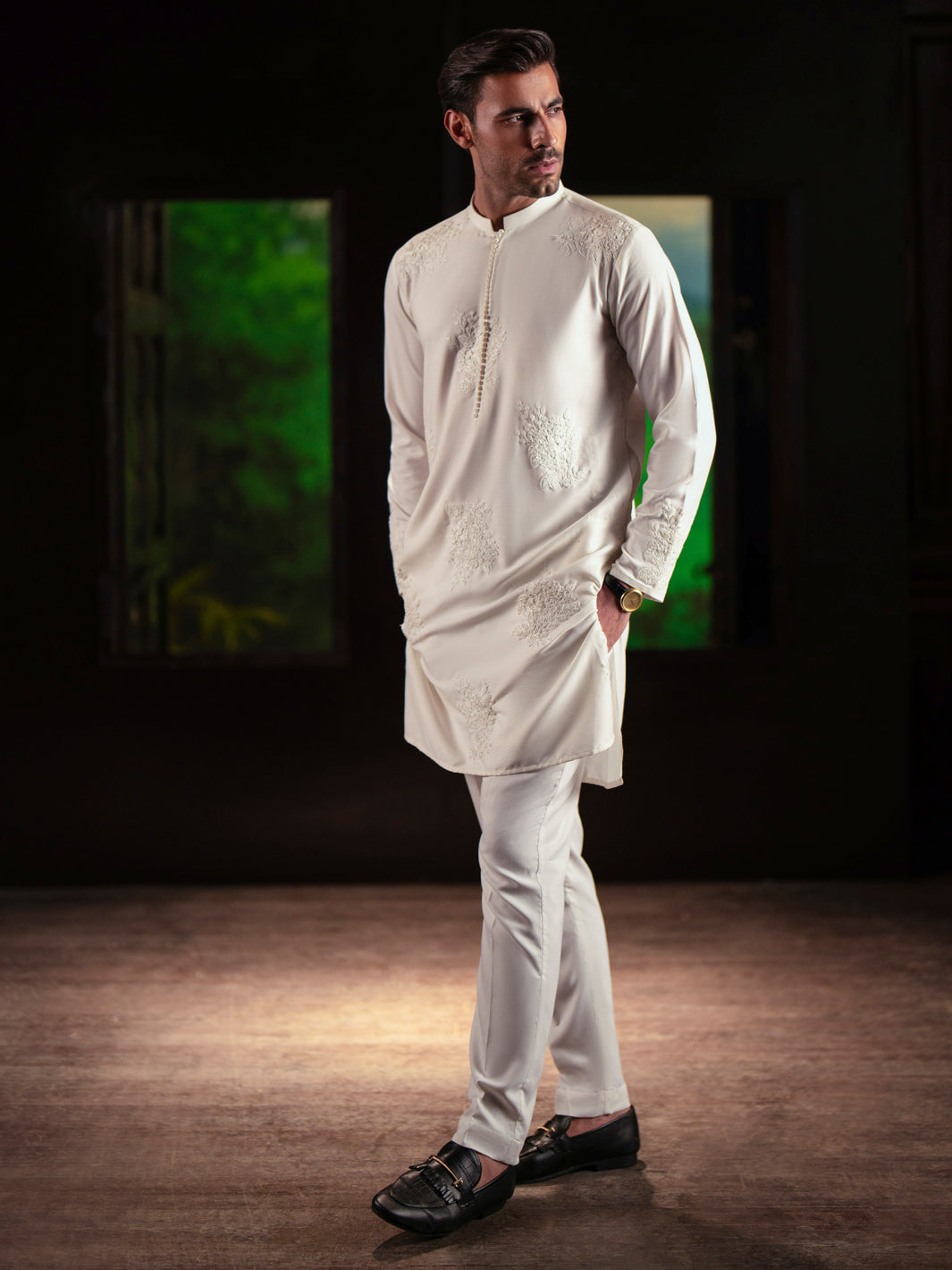 White Semi Formal Kurta Trouser Set With Intricate Dori Embroidered Motifs all Over