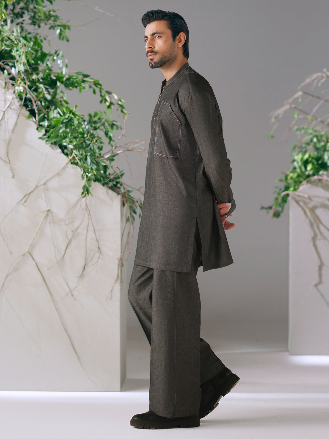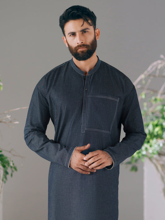 Charcoal Grey Denim Kurta Trouser Set Featuring Accent Stitch Details On the Placket And Sleeves