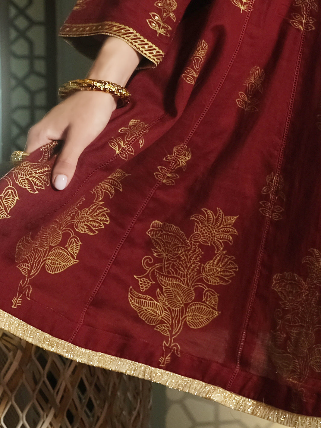 Deep Maroon Panel Mid Length Tunic With Gold Block Print Motive All Over. Hand Embellishment On Sleeves And Golden Kiran On Hemline.