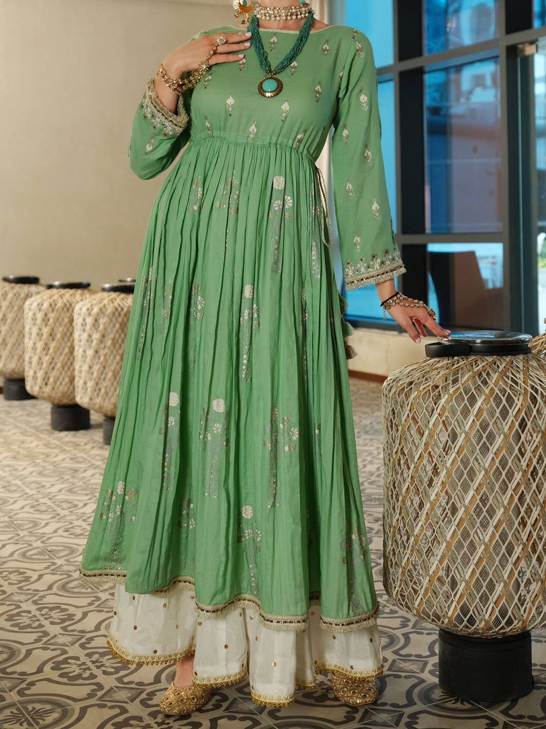 Long Length Flair Turquoise Green Tunic, Embellished With Gold, Silver And Off White Motifs Block Printed All Over. Adorned With Gota Lace And Tassels Detailing