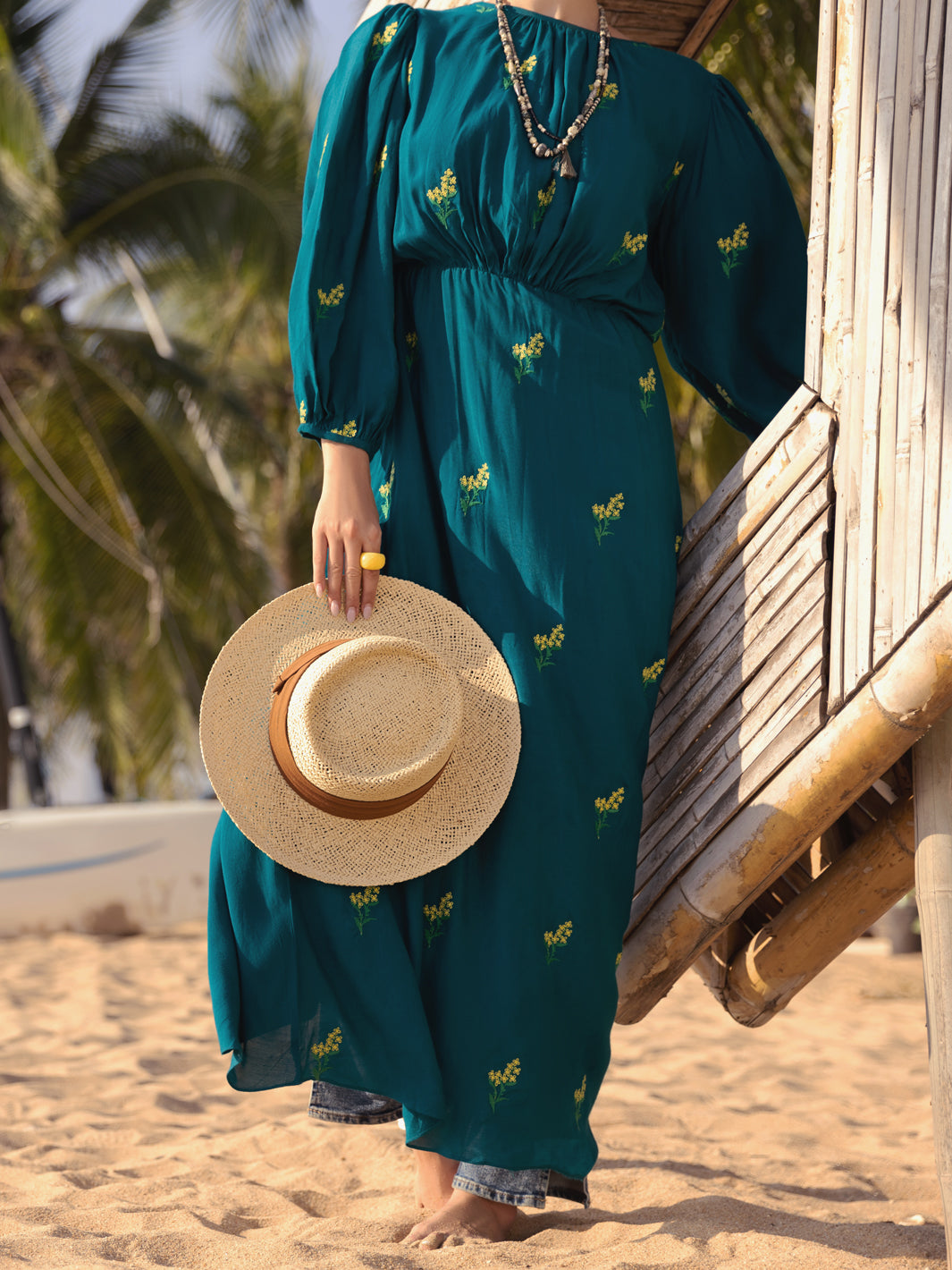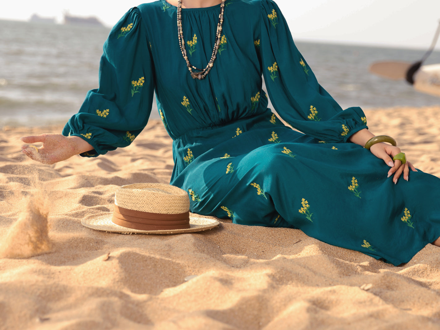 Maple Silk Long Embroidered Tunic With Gathers on Sleeves Shoulders and Neck.