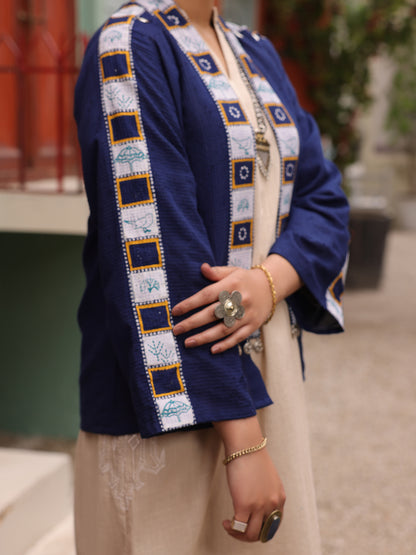 Square Dobby Short Shrug With Block Printed Details On Collar And Sleeves.