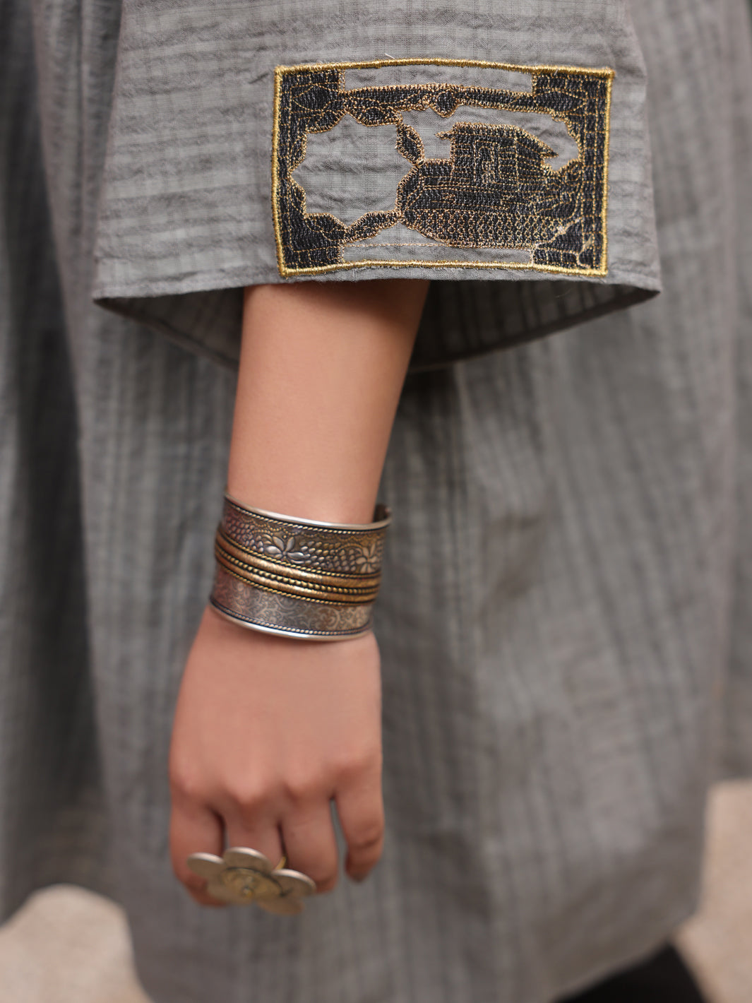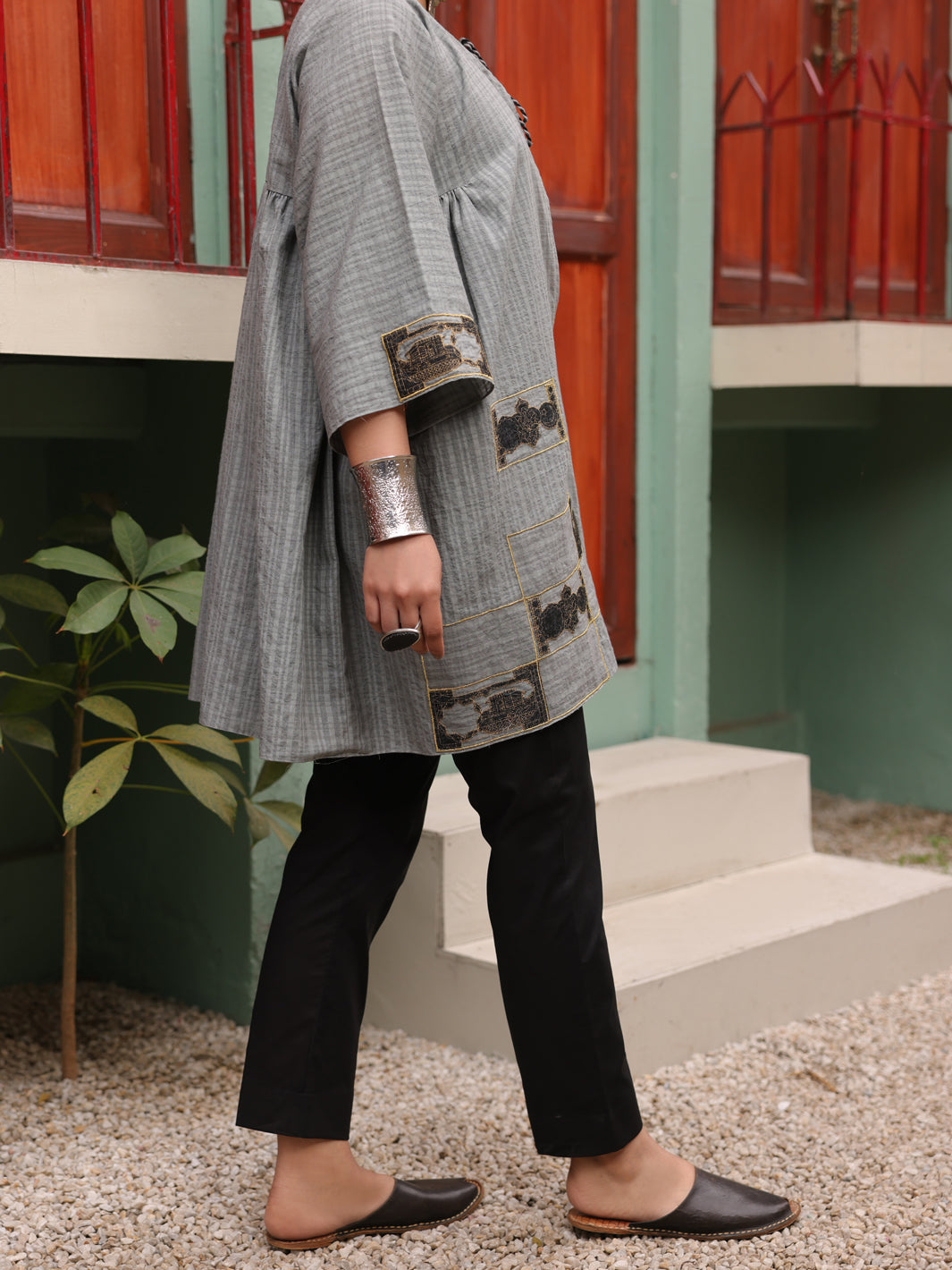 Front Open Style Dobby Shrug, Detailed With Embroidery Inspired From Currency Notes And Coins.