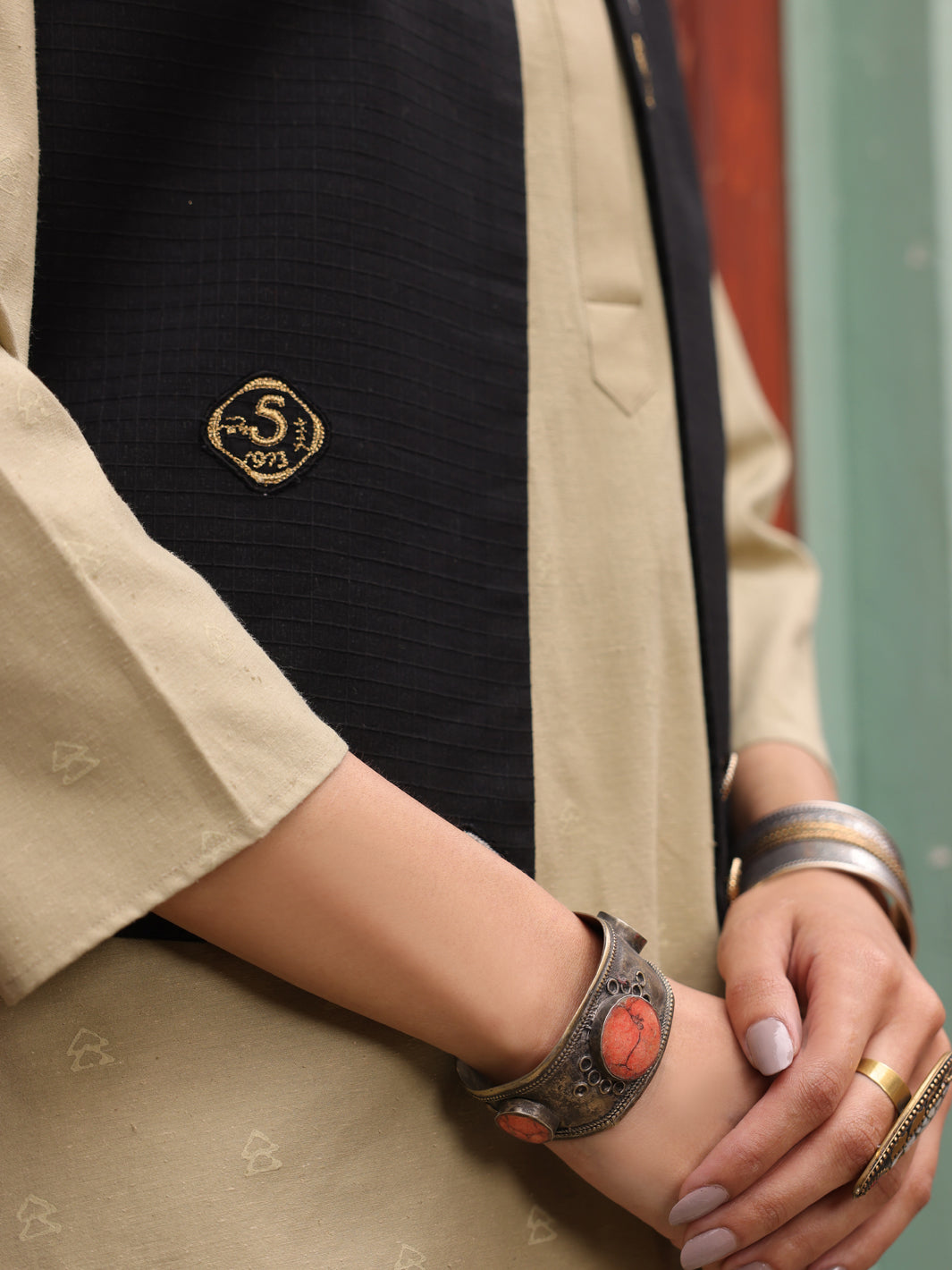 Inspired From The Coins, This Square Dobby Sleeveless Waistcoat Detailed With Brooch.