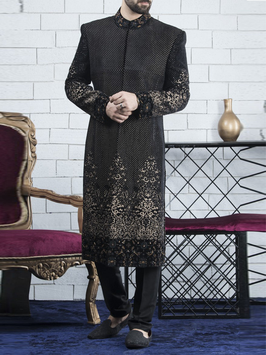 Golden Black Sherwani - AL-SW-056