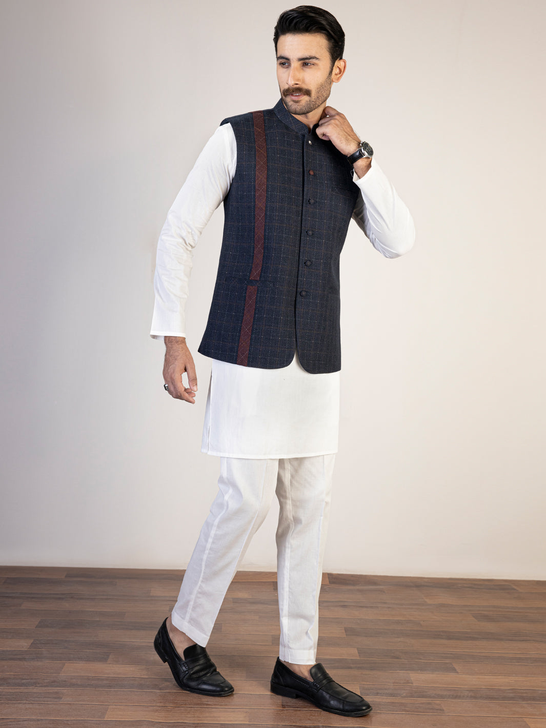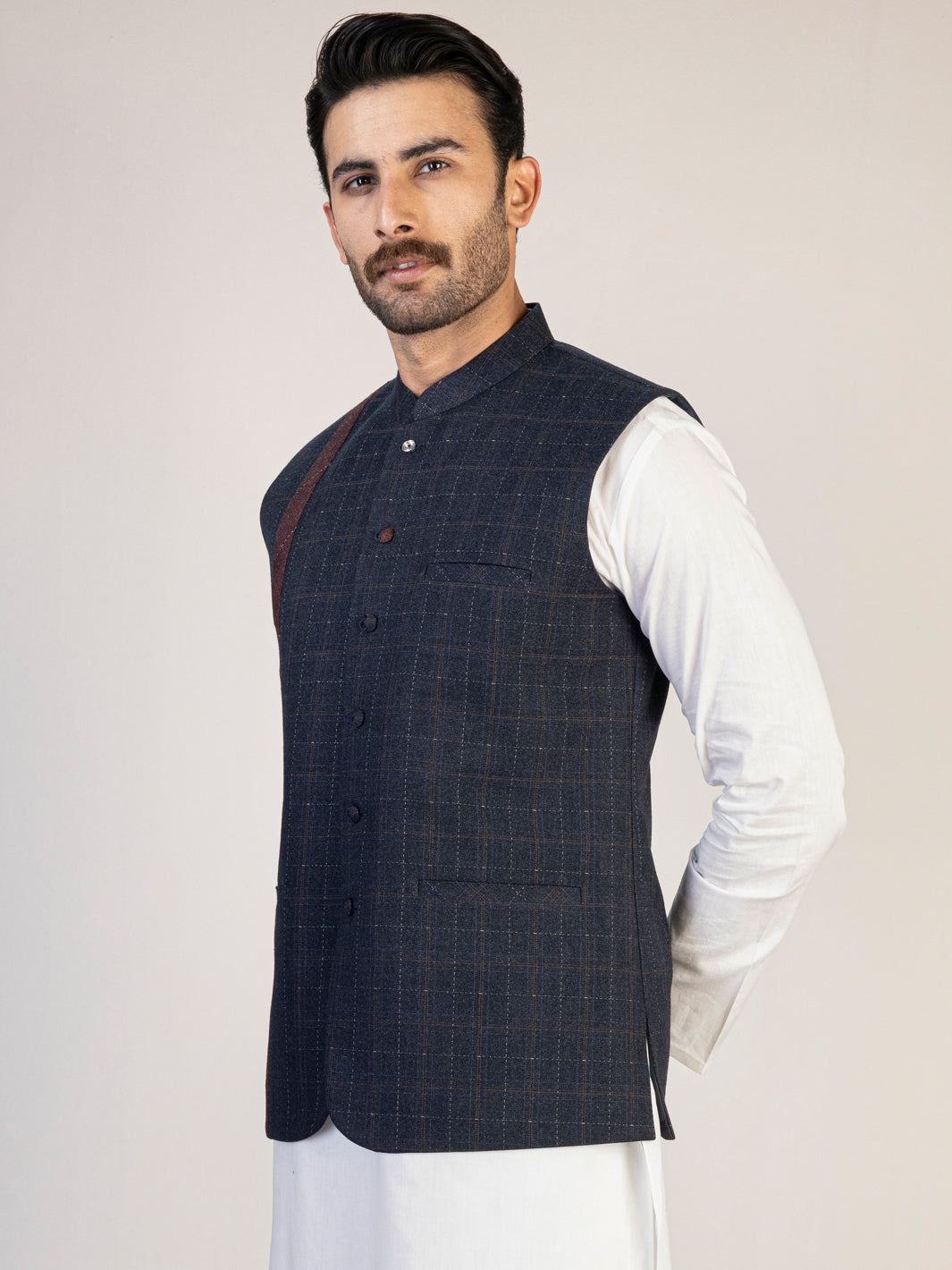 Plaid Fabric Waistcoat With Accent Patch and Fabric Buttons