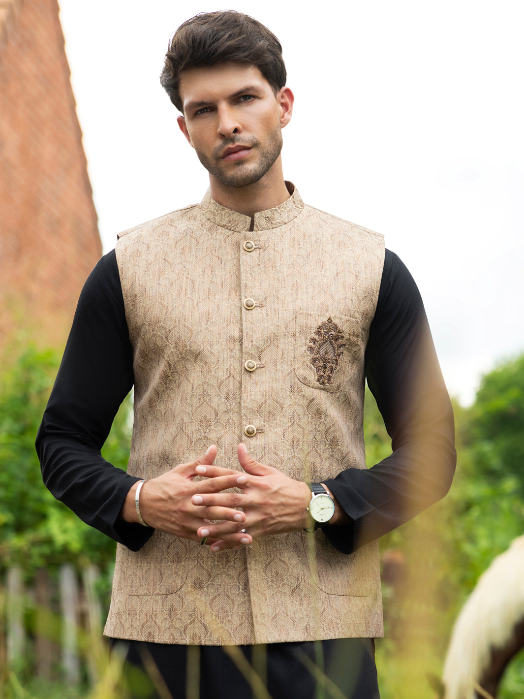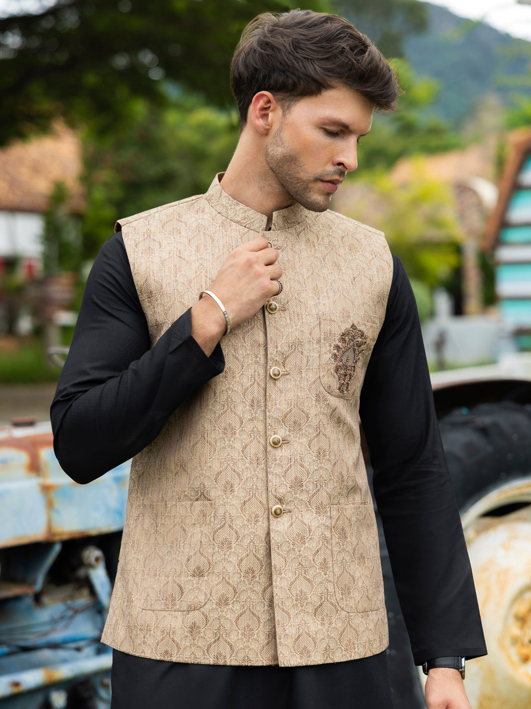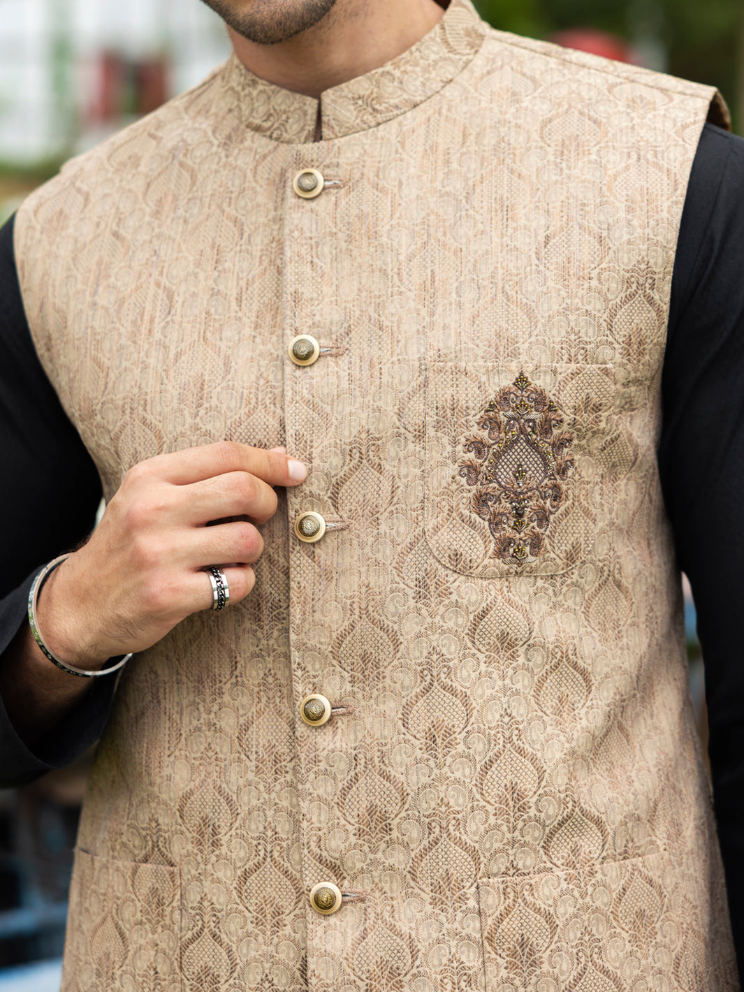 Semi Formal Waistcoat Adorned With High-Quality Buttons And An Embroidered Bunch On The Front