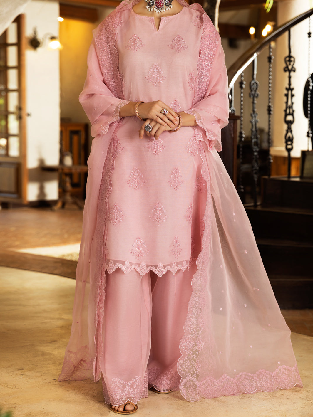 Overall embroidered organza long shirt with scallop details on sleeves and hemline.