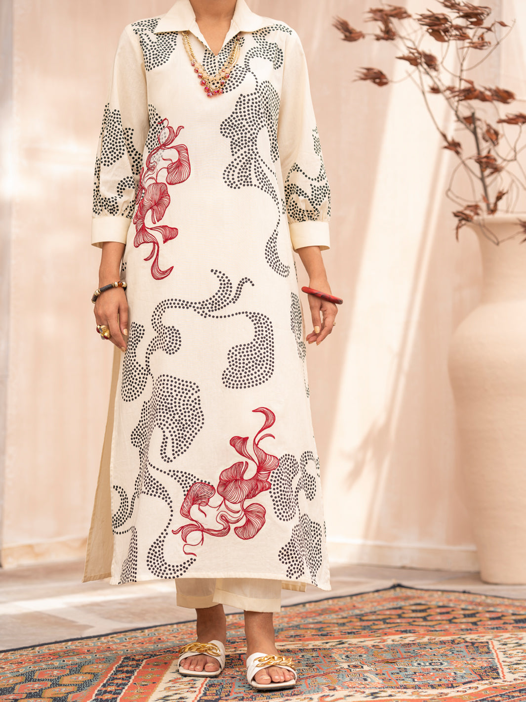 Long length white pasted shirt with neon embroidery motif randomly placed on front with overlapping collar.