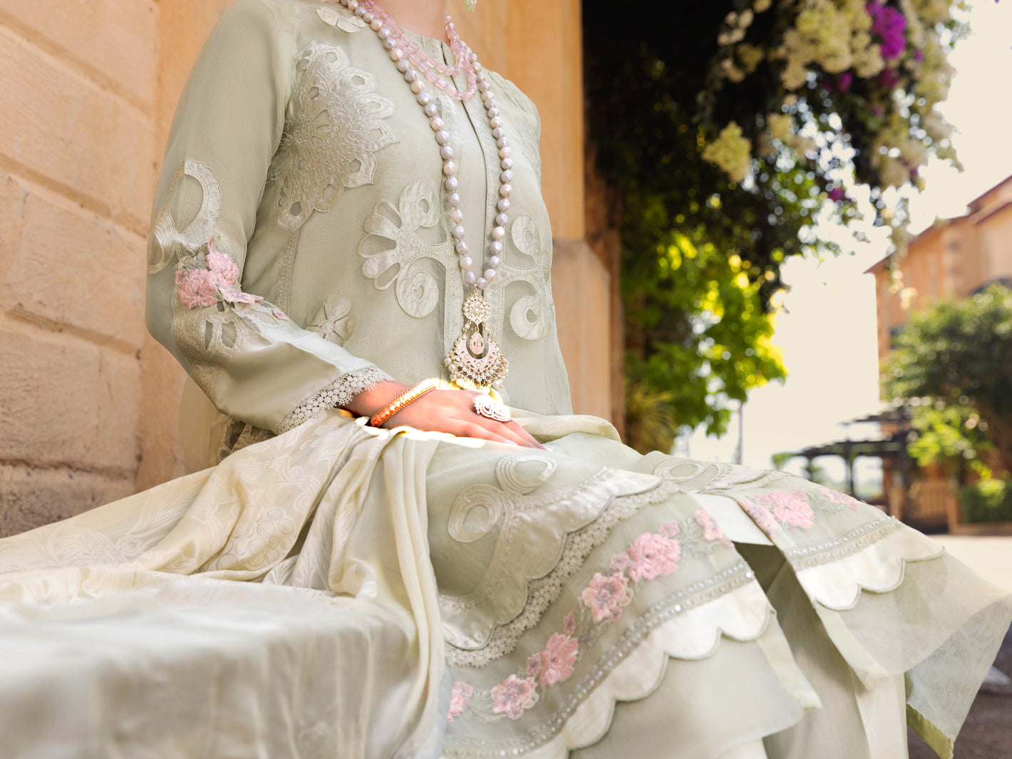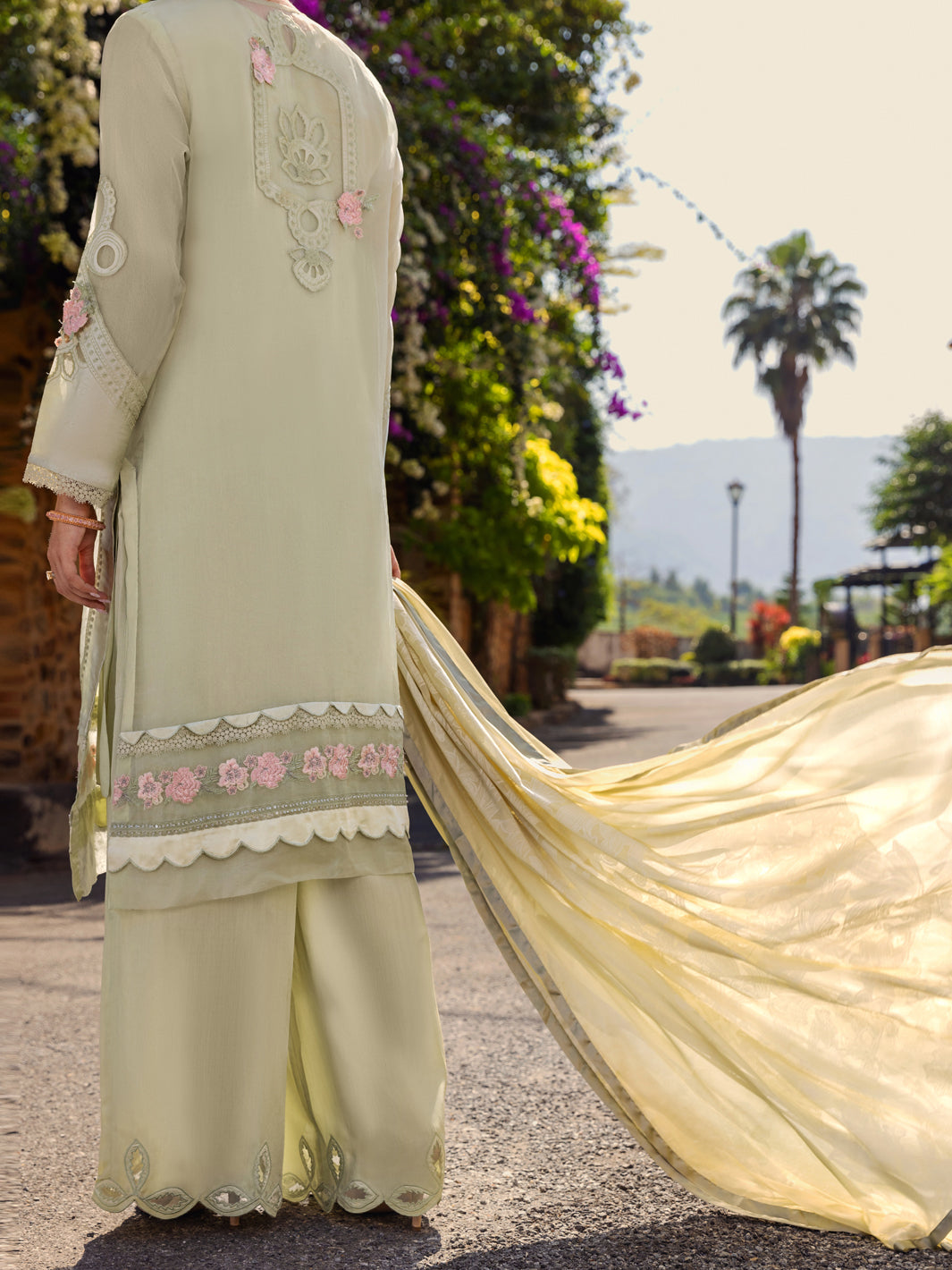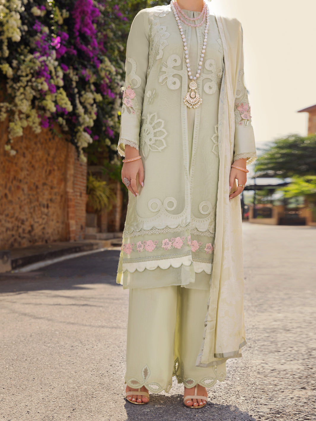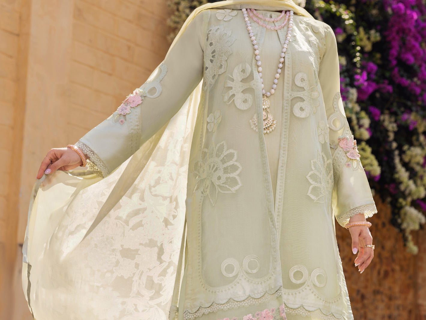 Laser Cutwork Silk And Organza Front Open Shirt With Beautiful Details Of Contrasting Floral Embroidery On Daman, Sleeves And Back Detailed With Scallop And Lace. Paired With Viscose Cutwork Embroidered And Burnout Silk Dupatta.