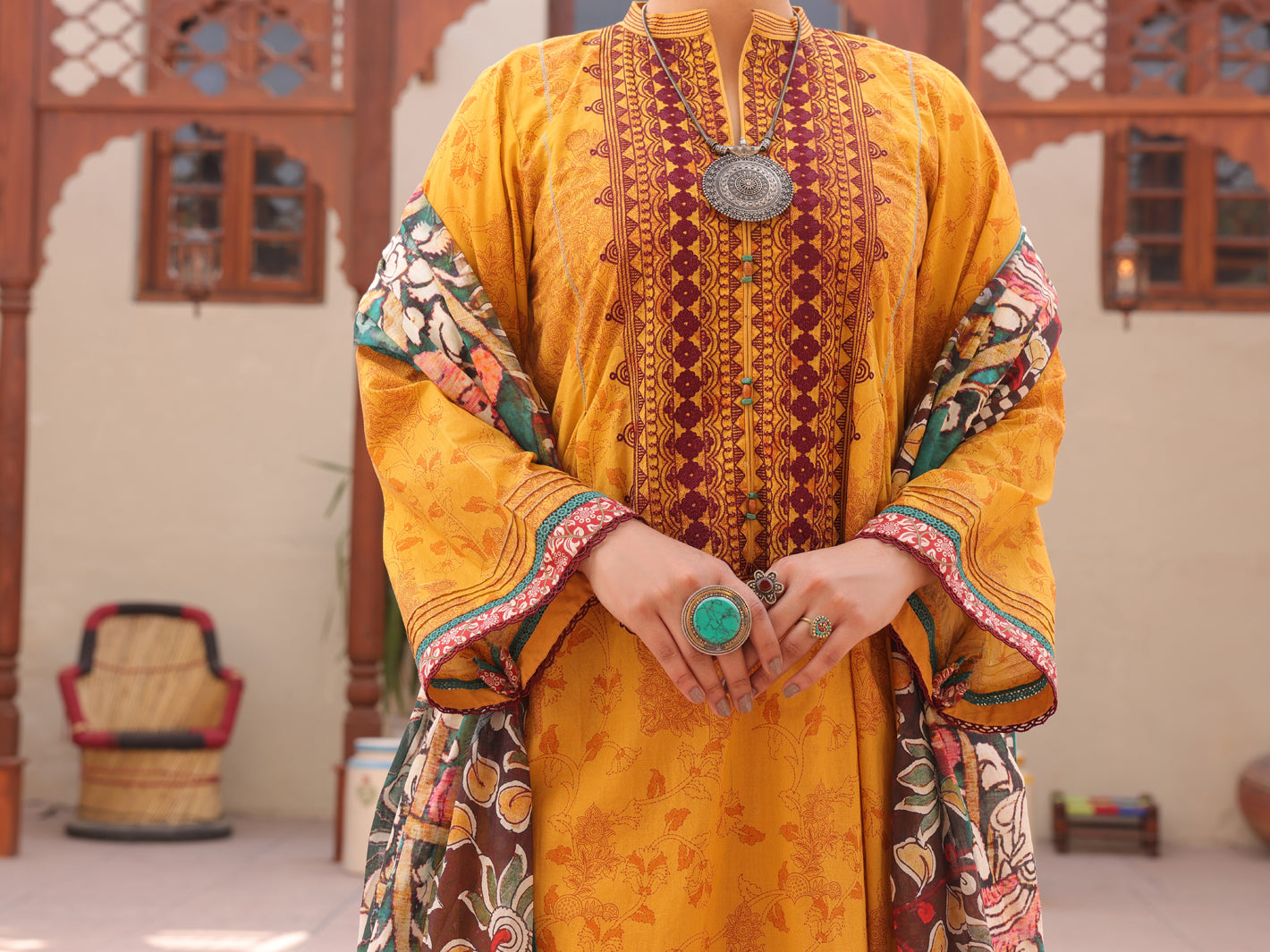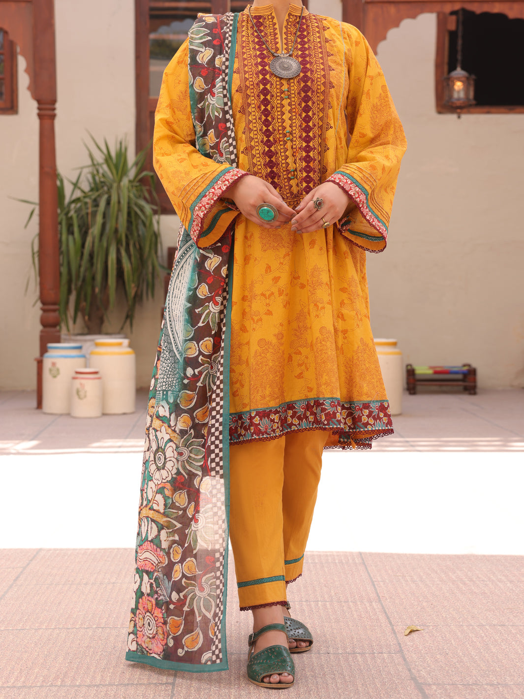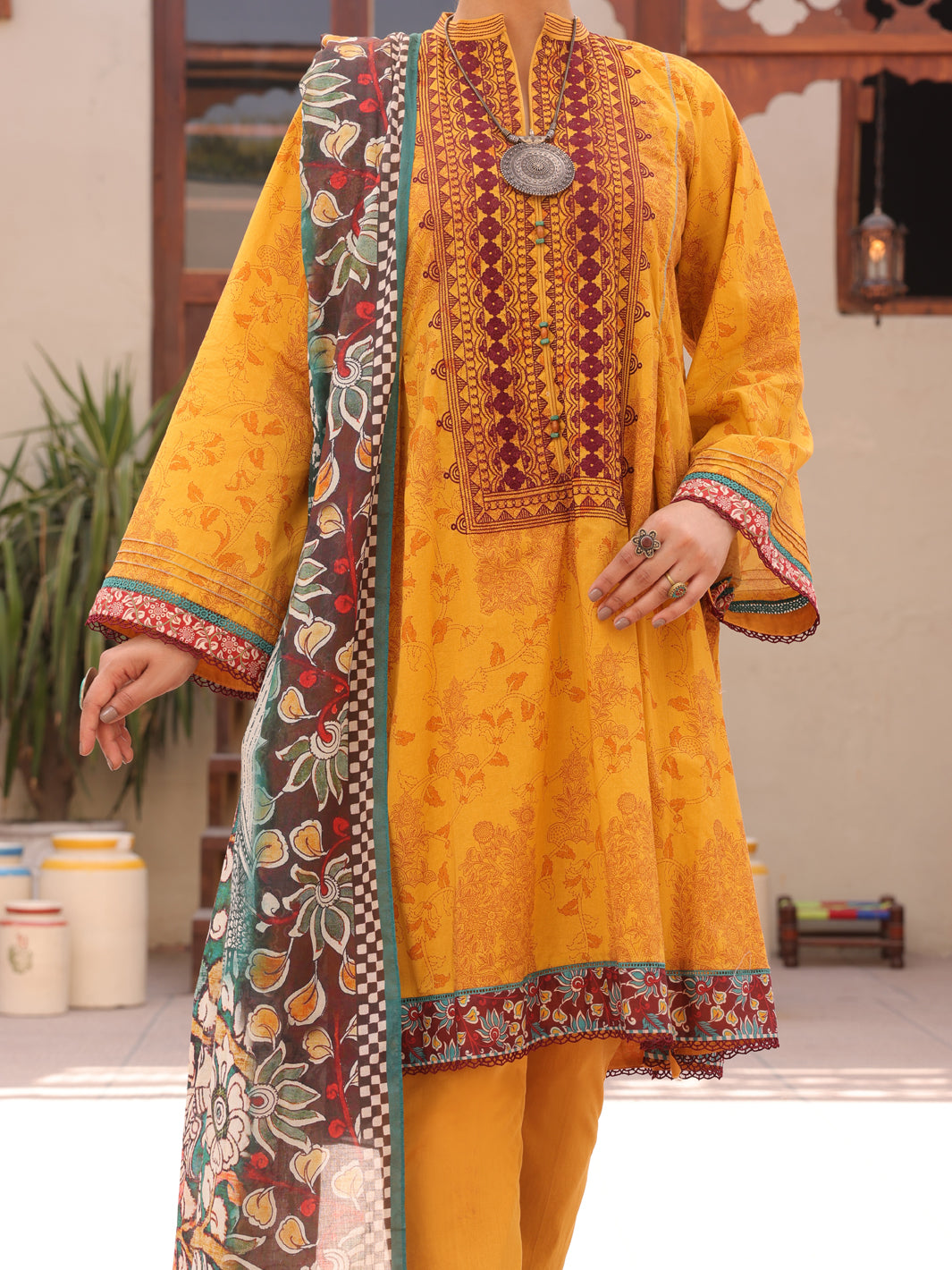 Yellow Lawn Digitally Printed Shirt With Embroidered Neckline And Sherwani-Collar Slit Neckline Detailed With Beads, Sleeves Further Detailed With Lace And Pintex, It Is Styled In A Pleated-Frock Manner. It Is Paired With Lawn Cigarette Pants Detailed With Laces And Paired With A Digitally Printed Lawn Dupatta