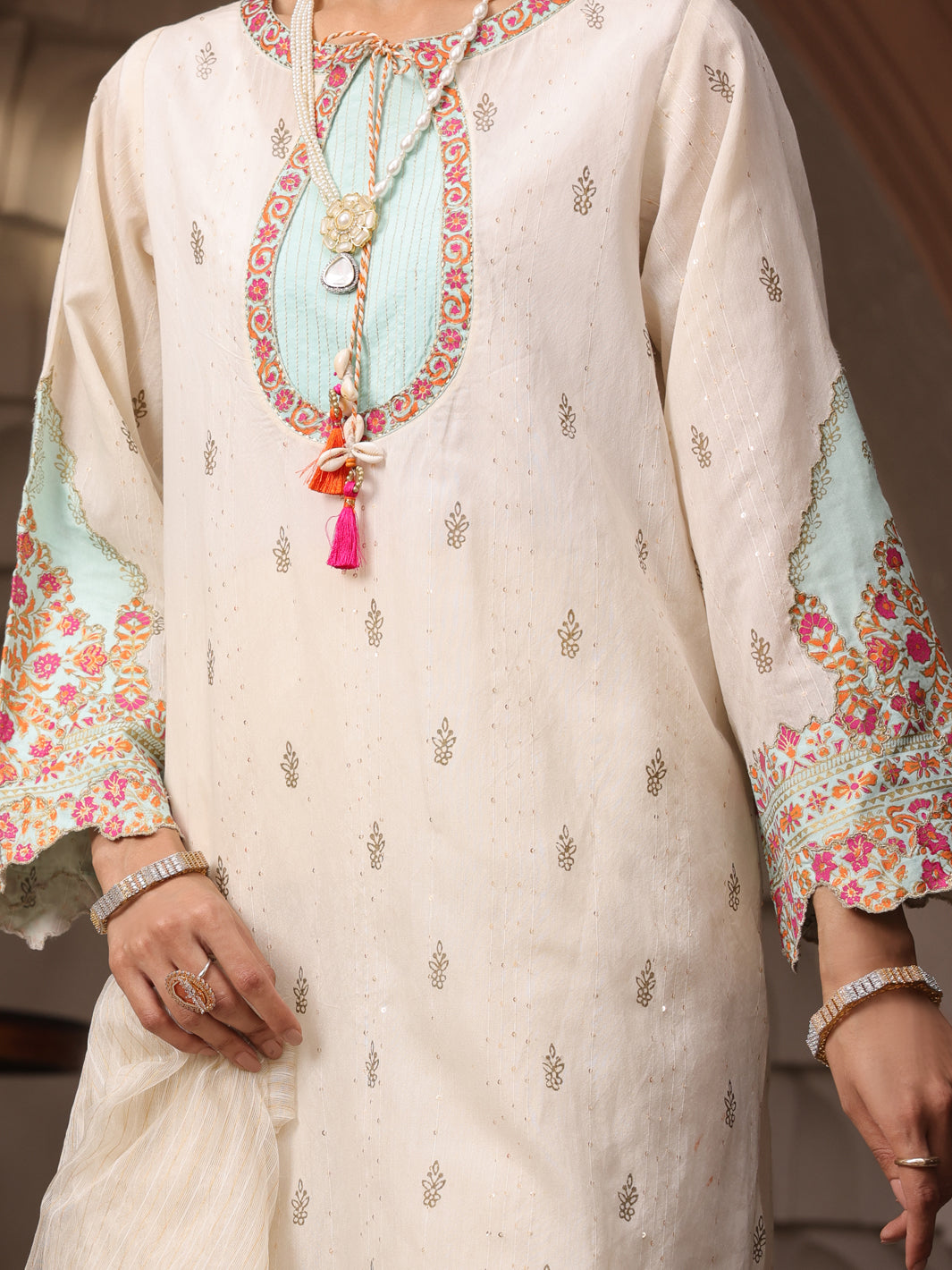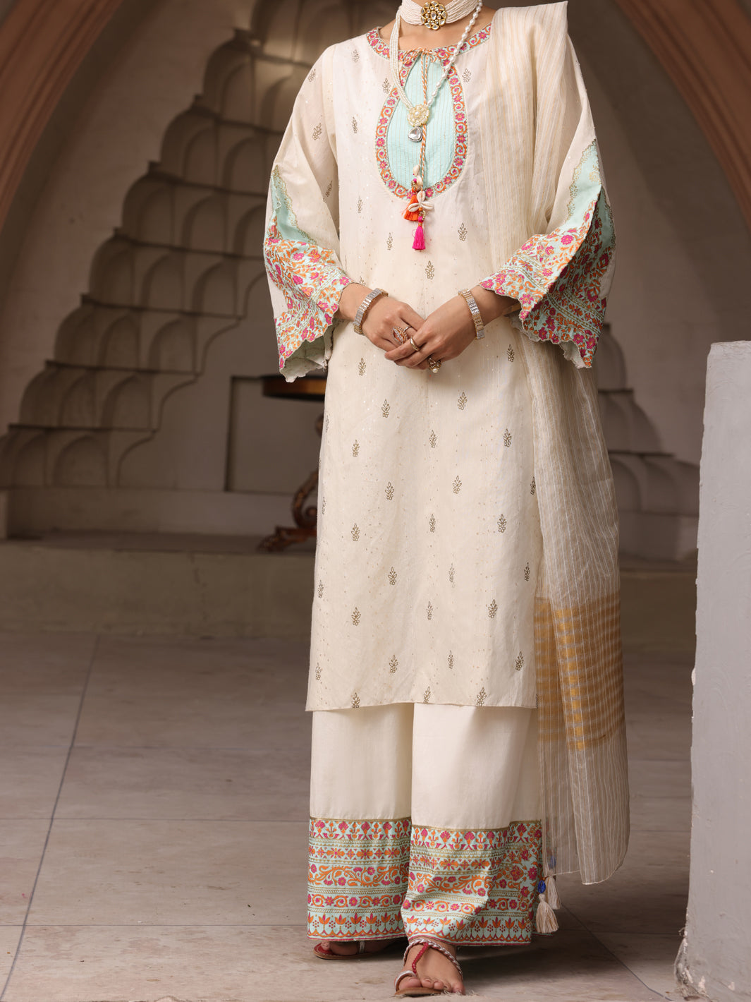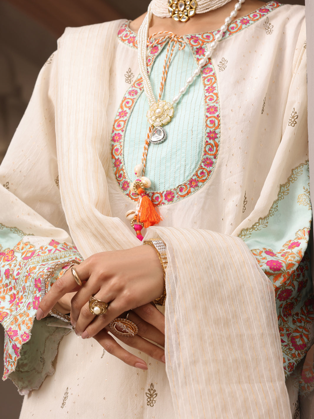 Off-White Sequins, Dobby, Block Printed Mid-Length Shirt With Contrasting Block Printed Appliqued Tear Drop Neck-Line, It Is Further Detailed With Contrasting Block Printed Appliqued Sleeve. Paired With A Matching Block Printed Cambric Ijar Pants And Matching Zari-Net Dupatta.