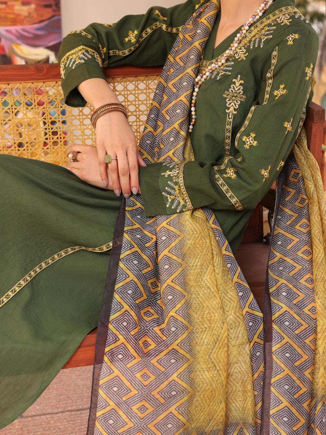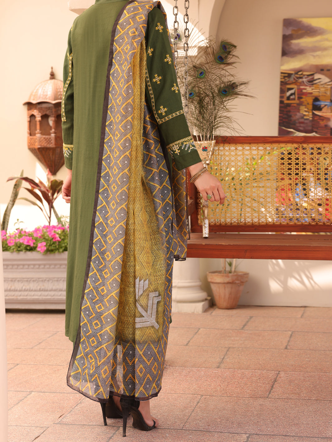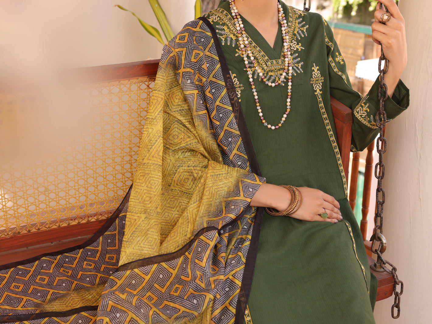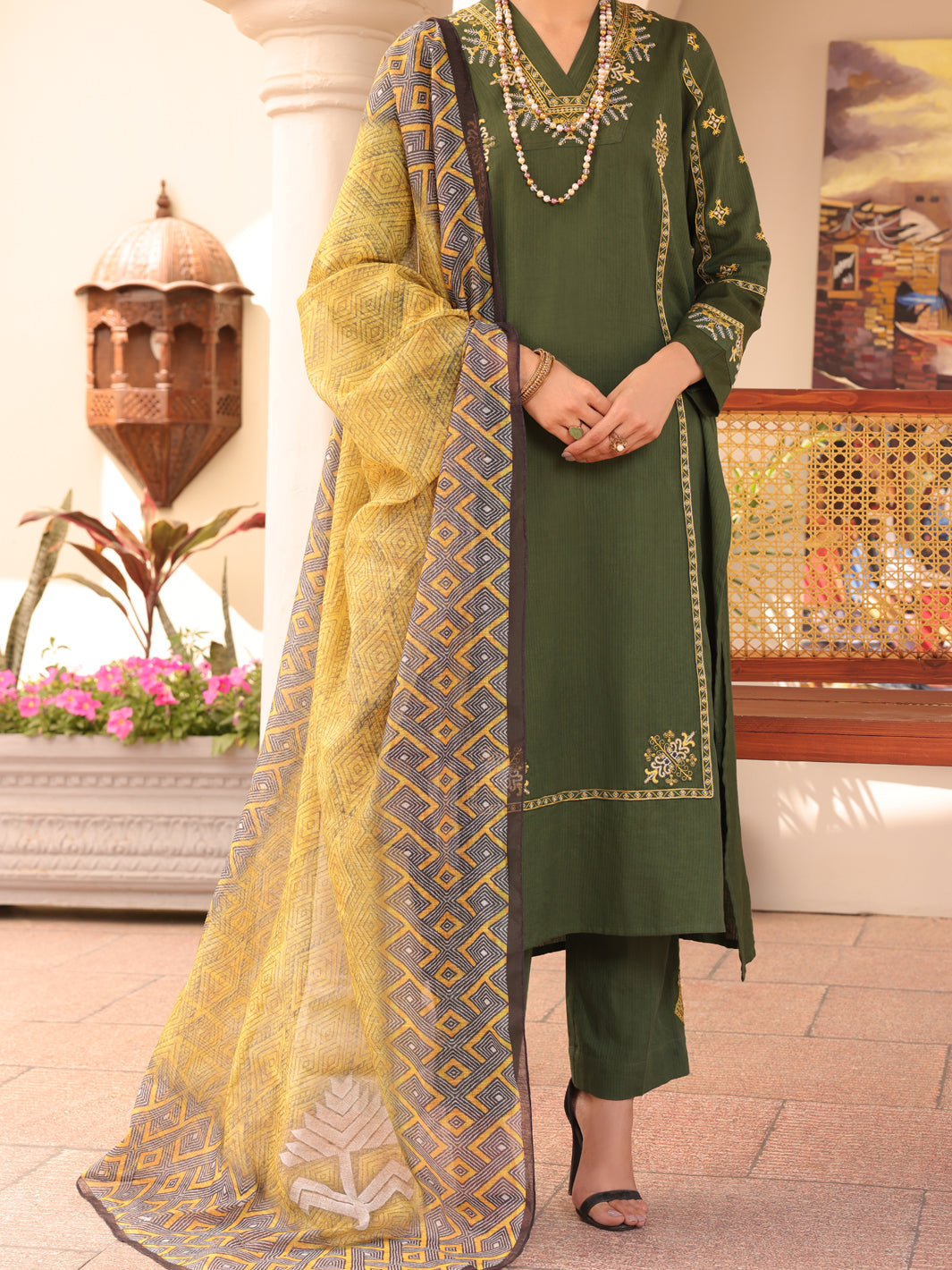 Dobby Embroidered Shirt With V- Neckline Paired With Fitted Pants Detailed With Embroidered On It And Digital Poly Net Dupatta.